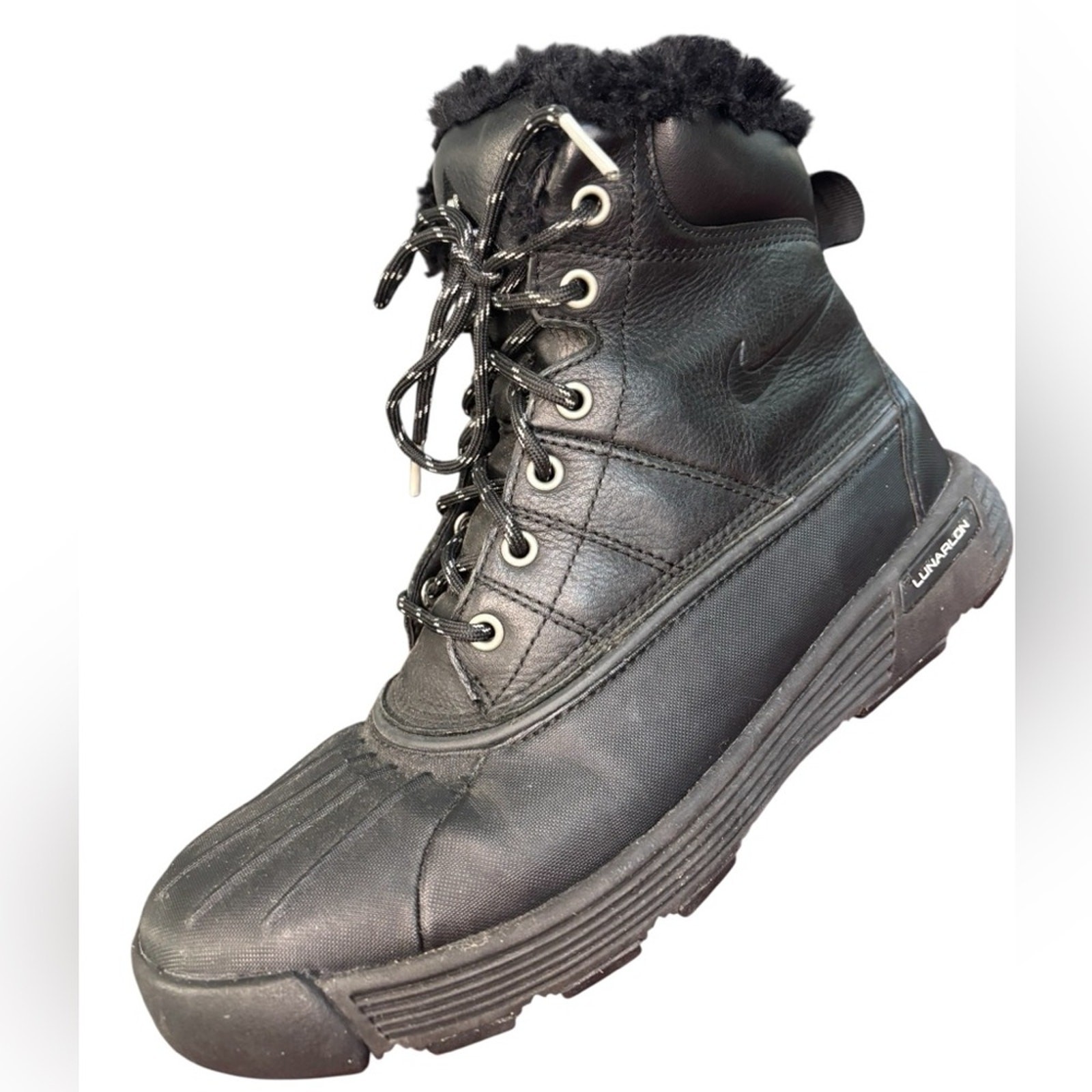 Step into style and durability with these Nike black boots, designed for ultimate comfort and support. Perfect for outdoor adventures, these boots offer a sleek look with a robust build to withstand various terrains. Experience the perfect blend of fashion and functionality with every step. NIKE ACG LUNARSTORM BOOTS Women's Sz 8 Black Leather Faux fur lined, waterproof Great condition! Very gently used.