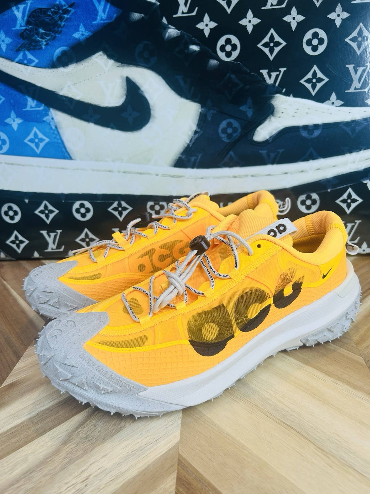 Nike ACG Mountain Fly 2 Low in Laser Orange, size 11.5. This sneaker features collaborations with Kith, Supreme, Cpfm, and renowned designers like Virgil and Travis. It is designed for various activities such as walking, hunting, and running with features like arch support and cushioning. The shoe is part of a limited edition release in 2023, making it a rare find for collectors.