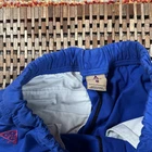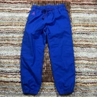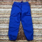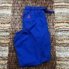 Nike ACG Trail Pants in size Medium, featuring a solid blue color with embroidered logo accents. These jogger-style pants are made of nylon and spandex microfiber fabric, offering water-resistant properties. They have an elastic waist and adjustable belt, along with pockets for convenience. Suitable for casual outdoor activities in various seasons, these pants have a tapered leg style with a 28-inch inseam for a comfortable fit.