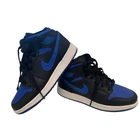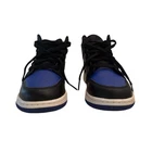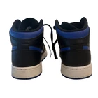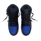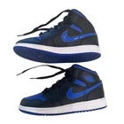 Classic Air Jordan 1 Mid sneakers featuring a sleek black and royal blue. These iconic basketball shoes offer both style and comfort with their durable leather construction, padded collar, and signature Air cushioning. Perfect for casual wear, school, sports practice, or making a bold street-style statement. The white midsole provides excellent contrast and all-day comfort. In excellent condition, no flaws. Length 10 inches #9 Keywords: air jordan 1, mid top, black royal blue, basketball shoes, youth sneakers, nike shoes, jordan brand, athletic footwear, kids shoes, black sneakers