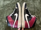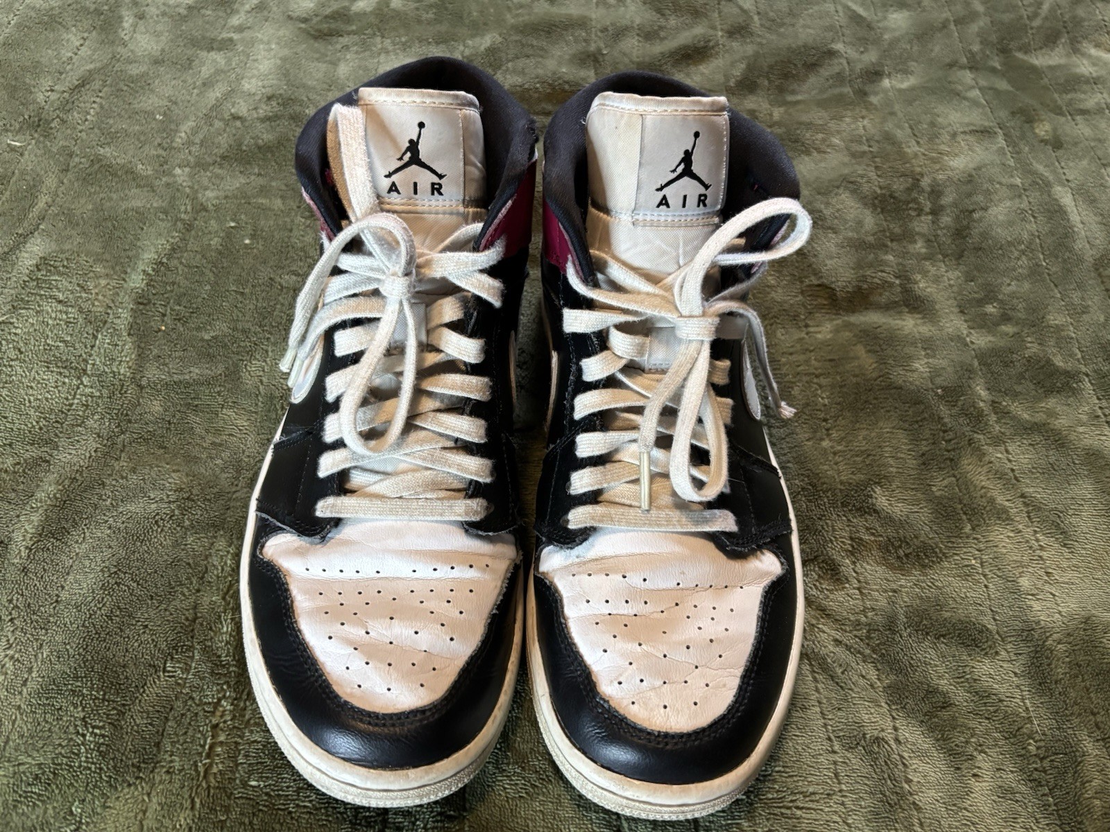 The Nike Air Jordan 1 Mid Black Noble Red BQ6472-016 is a women's basketball shoe in size 10, featuring a lace-up closure and a mid-top silhouette. This sneaker, released in 2019, showcases a colorblock pattern with accents of the Nike logo. Made with leather uppers and a rubber outsole, it offers cushioning and comfort for various activities such as walking, school, and basketball. The stylish design and retro sports theme make it a popular choice for activewear and casual occasions during the summer, fall, and spring seasons. These shoes have some small scuffs and areas of wear from being used and worn.
