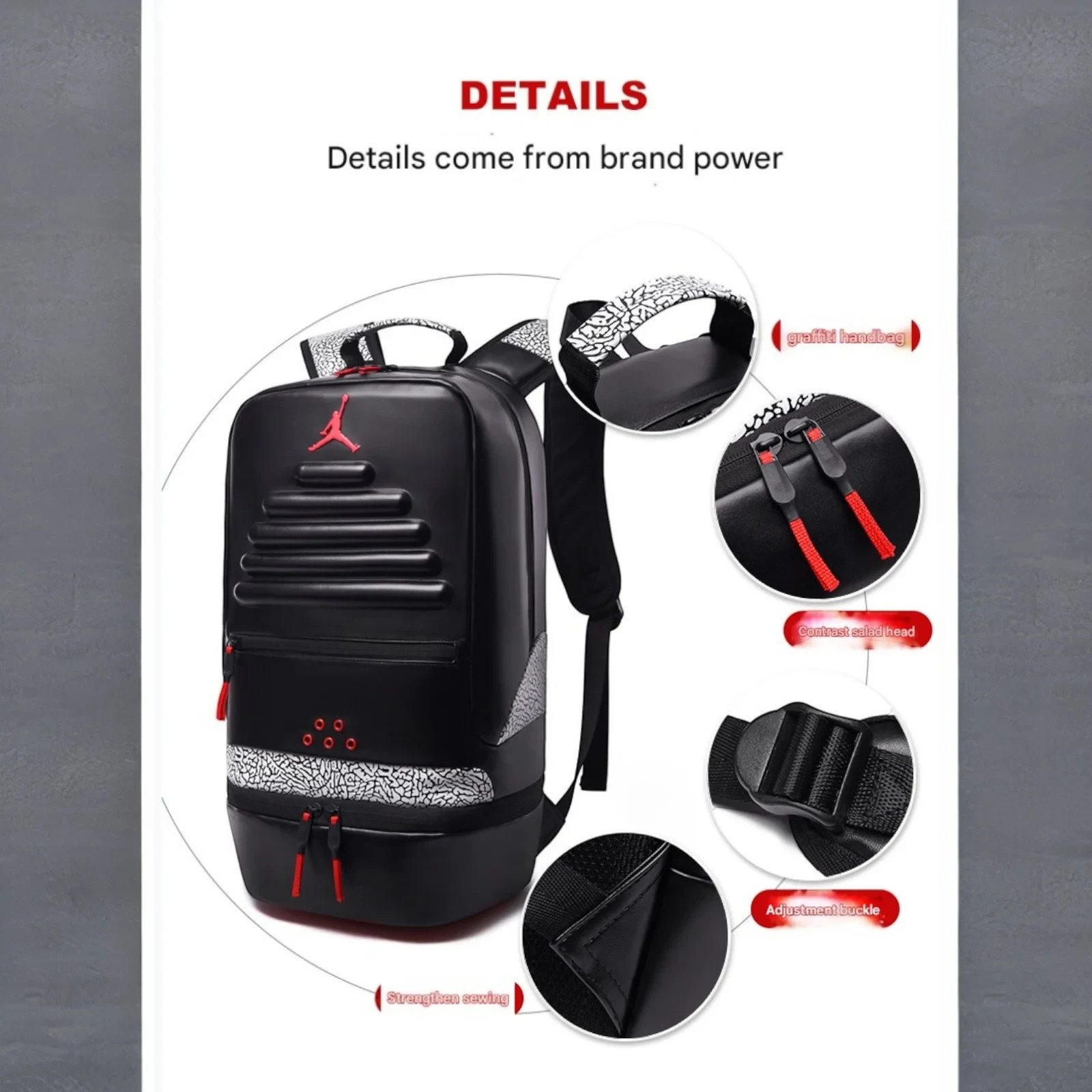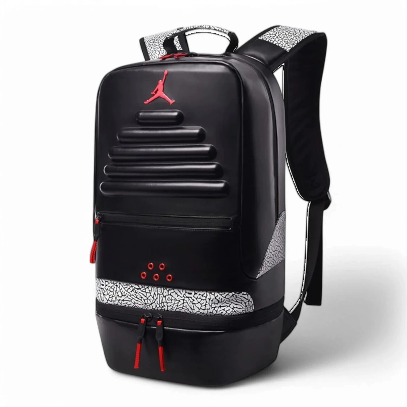 Durable PU leather construction for long-lasting use Elephant nubuck leather trim adds a premium touch Molded front panel provides a stylish, structured look Metal Jumpman logo gives you a fresh, iconic design TPU shrink wrapped zipper pulls for smooth operation Media sleeves offer storage space for your electronic devices Organizers help keep your items separated for easy access Shoe garage and ball carrier let you stay court-ready Toiletry pocket helps you stay fresh after games EVA molded straps allow for comfortable carrying 20" H X 11.5" W X 6.5" Made with 100% polyurethane for long-lasting quality