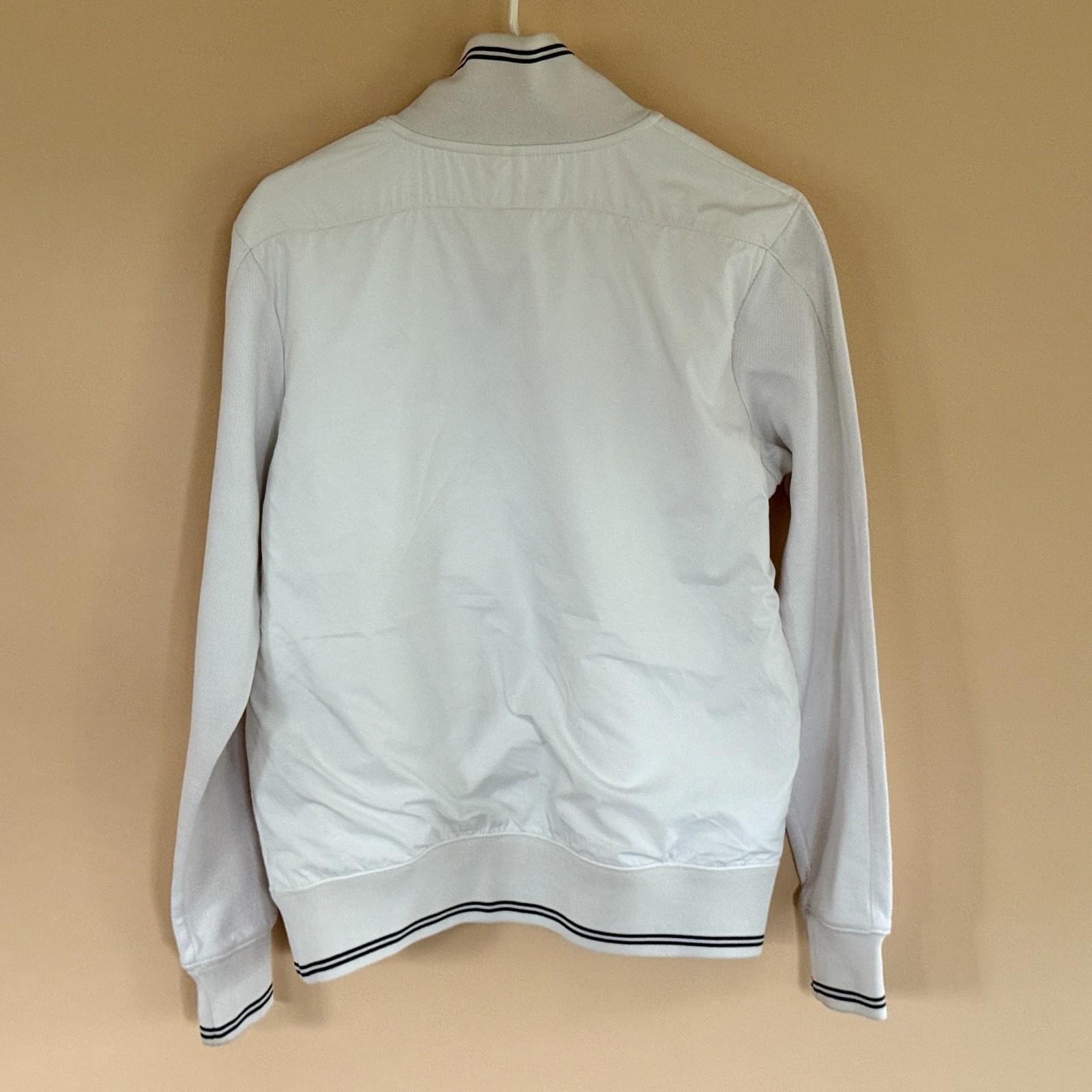 The Nike Air Jordan Paris Saint Germain White Full Zip Track Jacket is a stylish and versatile activewear piece for men in size Medium. Made of durable polyester material, this mid-length jacket features a solid white color with the iconic Paris theme. The full zip design and long sleeves make it perfect for staying warm in winter, fall, and spring seasons. Easy to care for with machine washable instructions, this track jacket is a must-have for any fan of the Paris Saint Germain team or the Nike brand.
