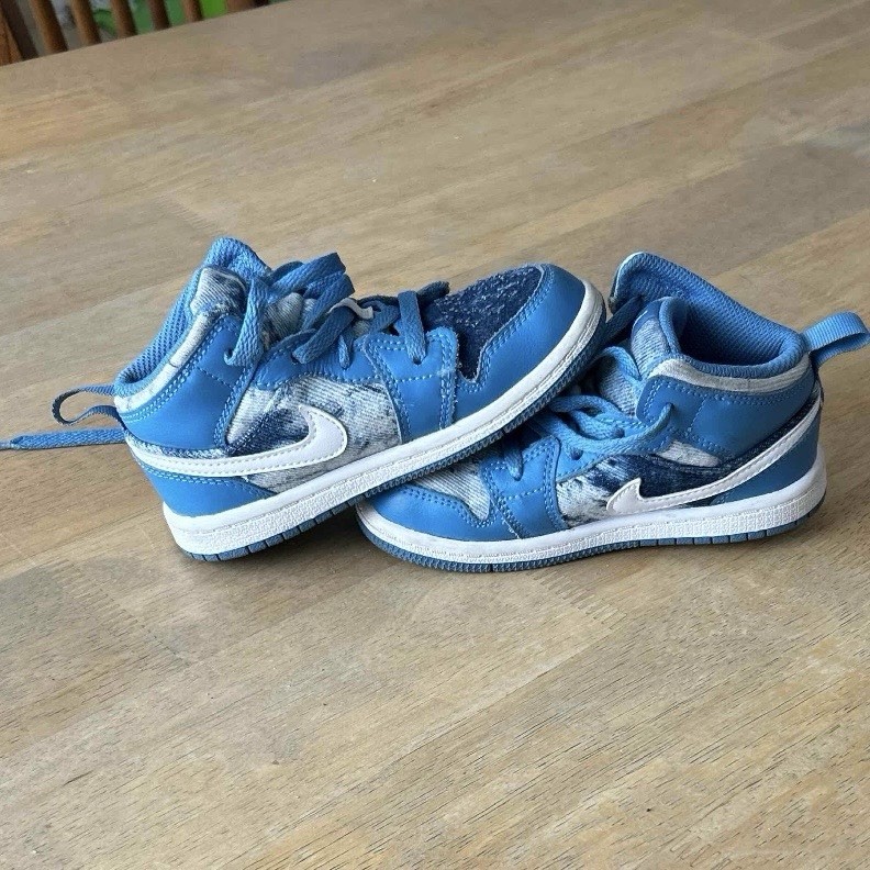 The Nike Air Jordan Retro 1 Mid Washed Denim Blue DM8950-400 in size 9C is an authentic sneaker designed for unisex baby and toddler wear. Featuring a denim upper made of cotton, this athletic shoe is part of the Nike Air product line and showcases a retro theme. The iconic Air Jordan 1 Mid model in a stylish blue color makes it a fashionable and comfortable choice for little ones.