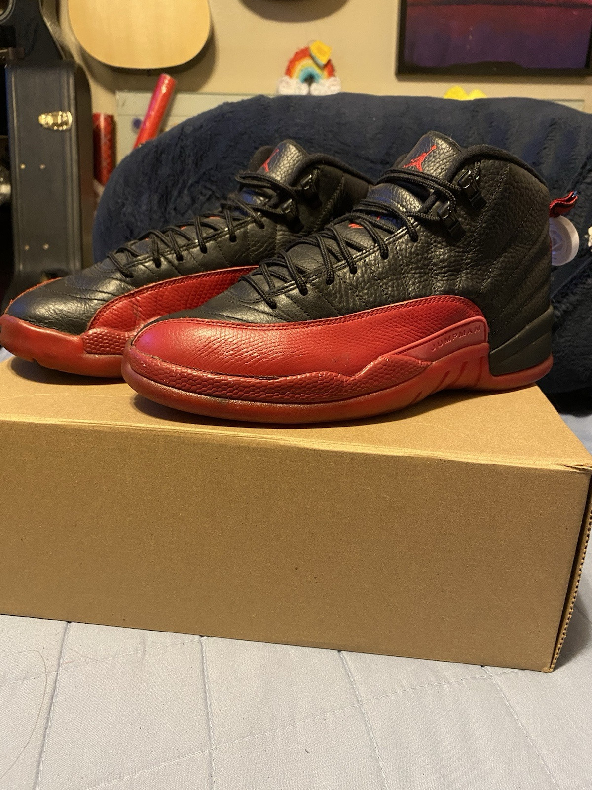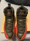 This Nike Air Jordan Retro 12 Flu Game is a pre-owned sneaker designed for men in size 8. It features a lace-up closure and comes in a classic black color with a retro theme. The Air Jordan 12 model is known for its comfort and performance, making it ideal for basketball activities. Made with leather upper material, this athletic shoe from the Air Jordan product line by the Jordan brand is a stylish choice for sneaker enthusiasts looking for a classic design.