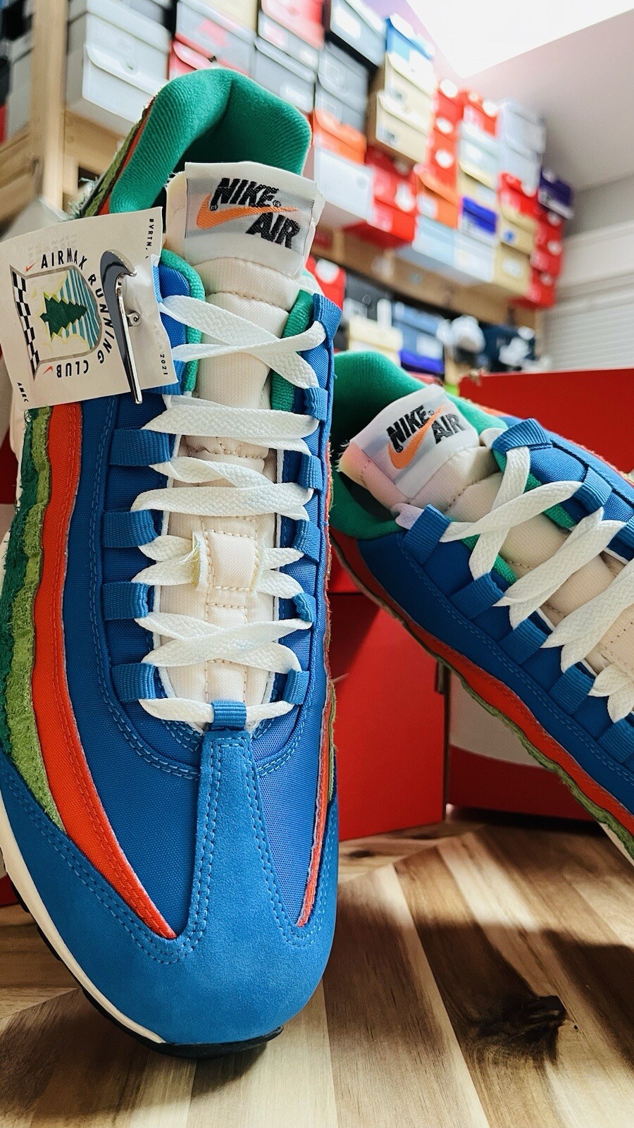 Nike Air Max 95 SE "Running Club" CPFM in size 12 features a multicolor design with Photo Blue and Roma Green accents. This limited edition sneaker, part of the Nike Air Max line, showcases a low-top silhouette with suede upper material, lace-up closure, and rubber outsole. The design is influenced by various themes such as USA, celebrity, college, and classic, making it a standout choice for those seeking comfort and performance in their athletic shoes.