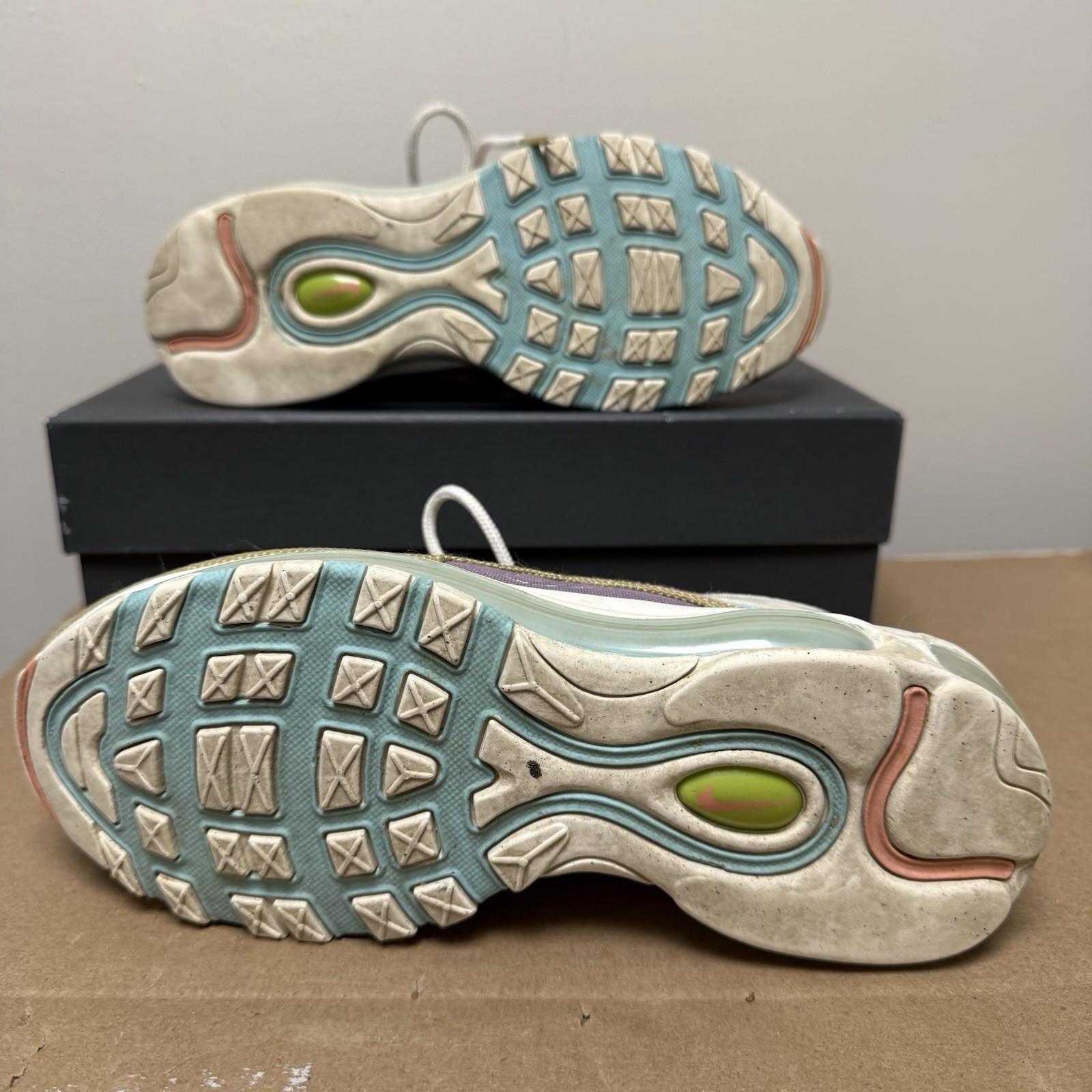 The Nike Air Max 97 SE GS Sun Club Copa Sail Wheat Grass DQ4126-400 6Y 38.5 is a stylish and comfortable pair of athletic shoes for women. Featuring a lace-up closure, rubber outsole, and cushioned insole, these sneakers are perfect for various occasions such as casual wear or activewear. The colorblock pattern and 90s theme give them a unique and trendy look, while the leather upper material adds durability and a premium feel. Whether you're hitting the gym or lounging with friends, these Nike Air Max are a fashionable and functional choice for any season.