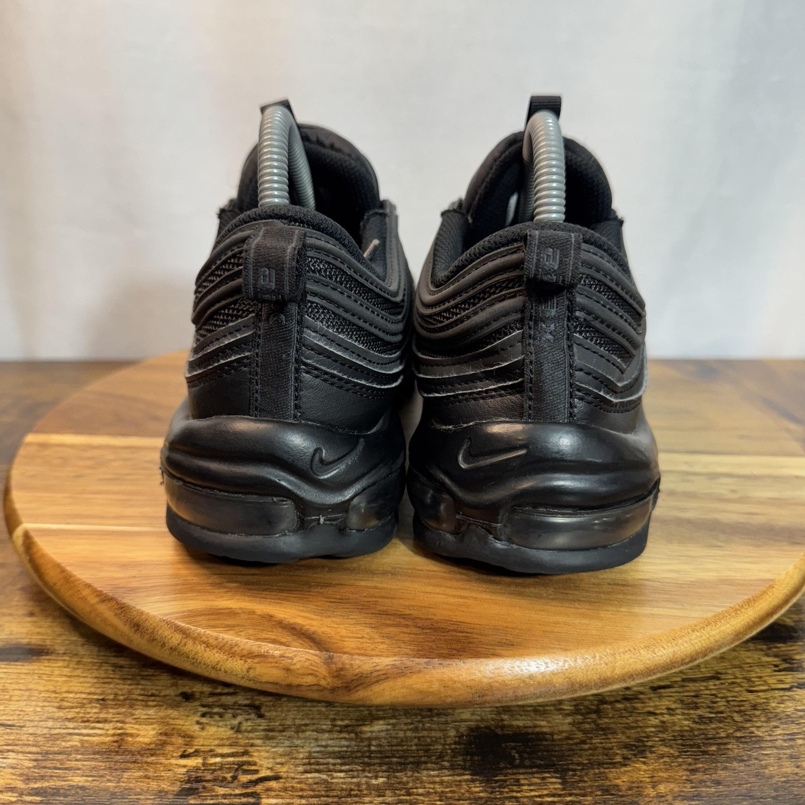 Brand: Nike Style: Air Max 97 lifestyle and running shoes with signature wavy layered upper and full-length visible Air unit. Color: Black / Triple Black Gender: Womens Size on tag: US 9.5, UK 7, EUR 41, cm 26.5, BR 39.5, CN 265 (2.5) Style/Model code: DH8016-002 UPC: 00195869222387 Tag dates: 01/05/22 to 03/25/22 (per inner label). Details: Mesh and synthetic upper with leather overlays, reflective piping accents, embroidered Nike Swoosh logos, lace-up closure, padded collar and tongue, heel and tongue pull tabs, full-length visible Max Air cushioning, and durable rubber outsole.