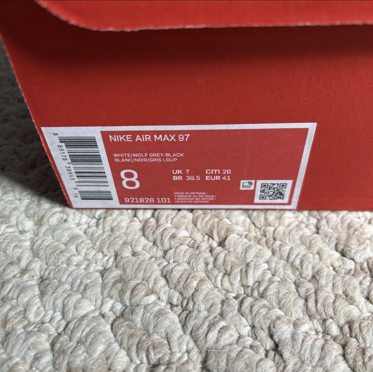 The Nike Air Max 97 Wolf Grey Size 8 Men’s is a stylish and comfortable sneaker perfect for activewear and casual occasions. Featuring a lace-up closure, low-top shoe shaft style, and solid pattern, these shoes are designed for running and jogging in the summer, fall, and spring seasons. The shoe's design includes a grey wolf character theme and a rubber outsole for durability. With a color combination of white, grey, and black, these Nike Air Max 97 sneakers are a popular choice for those looking for a trendy and functional footwear option.
