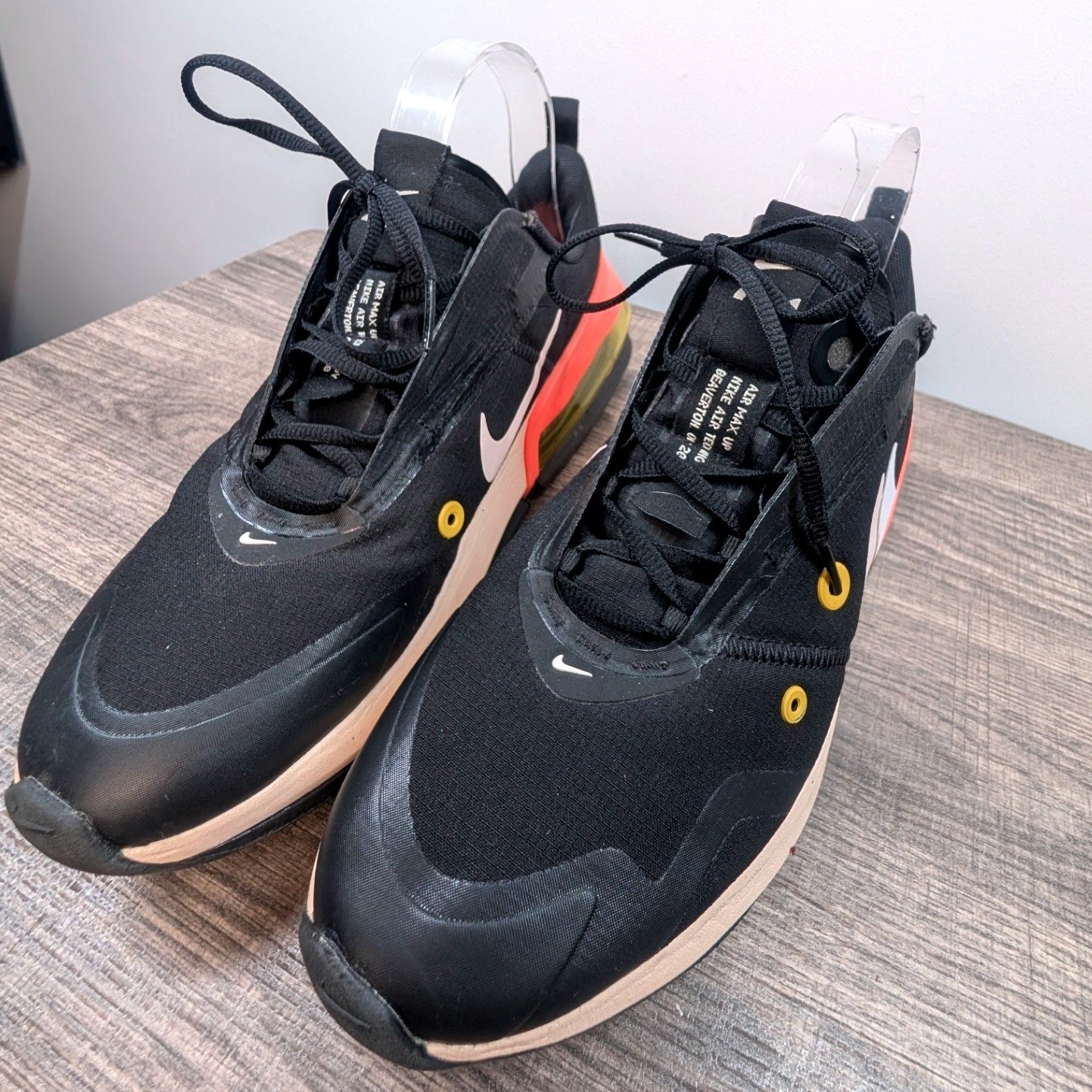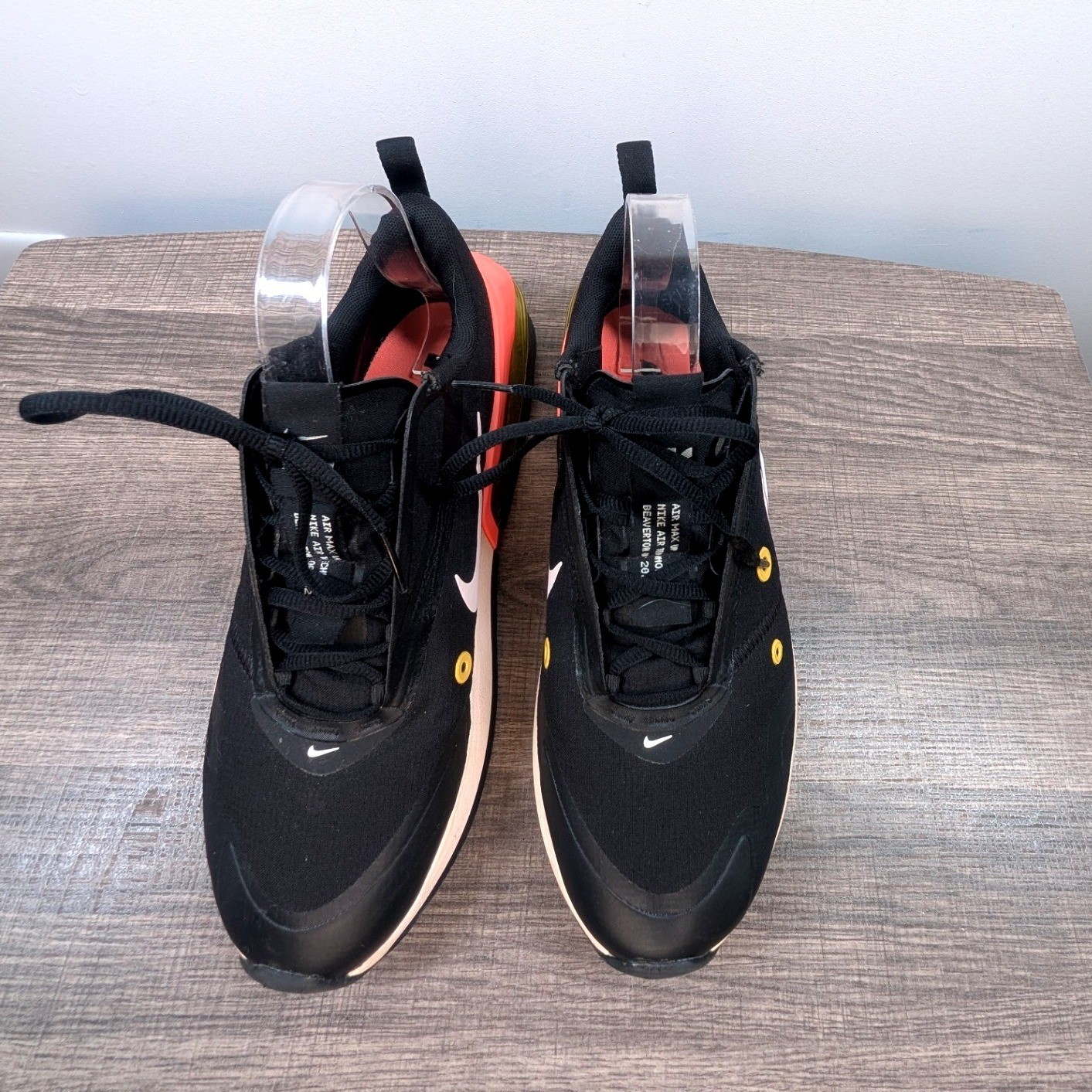 Nike Air Max women's athletic shoes in black with coral and white accents. These stylish sneakers feature a distinctive sculpted midsole with visible Air cushioning for enhanced comfort and support. The dynamic lacing system offers a secure fit, while the breathable mesh upper ensures ventilation. Perfect for everyday wear, light workouts, or casual outings. Department: Women Upper Material: Textile Features: Cushioned, Lightweight, Comfort, Performance, Padded Shoe Width: Standard Performance/Activity: Running & Jogging, Gym & Training, Walking Accents: Logo Style: Sneaker Type: Athletic Shoe Shaft Style: Low Top Insole Material: Foam Pattern: Solid Keywords: Nike Air Max, Women's sneakers, Athletic footwear, Running shoes, Casual shoes, Comfortable sneakers, Sporty style, Air cushioning, Lightweight shoes, Everyday wear, Workout shoes, Fashion sneakers Save on shipping and bundle!