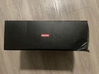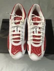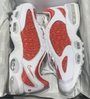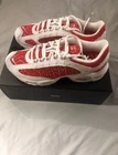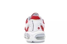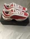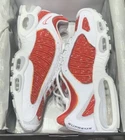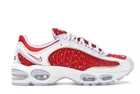 This Nike Air Max Tailwind 4 x Supreme University Red 2019 sneaker, style code AT3854-100, features a low-top design in a vibrant red colorway. It is a men's athletic shoe in size 10, ideal for running and jogging activities. The collaboration between Nike and Supreme adds a stylish touch to this model, which belongs to the Nike Air Max product line. This sneaker combines comfort and performance with a sleek and fashionable aesthetic. Box has damage in one corner