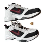 The Nike Air Monarch Men's sneakers in white with black and varsity red accents are a stylish and durable athletic shoe perfect for any man's wardrobe. Made with leather uppers and featuring Nike's Air technology, these shoes provide comfort and support for all-day wear. The iconic Nike swoosh and branded design make these sneakers a timeless choice for any casual or sporty outfit. The model, Nike Air Monarch III, is known for its quality construction and classic color combination, making it a versatile and reliable option for everyday wear.