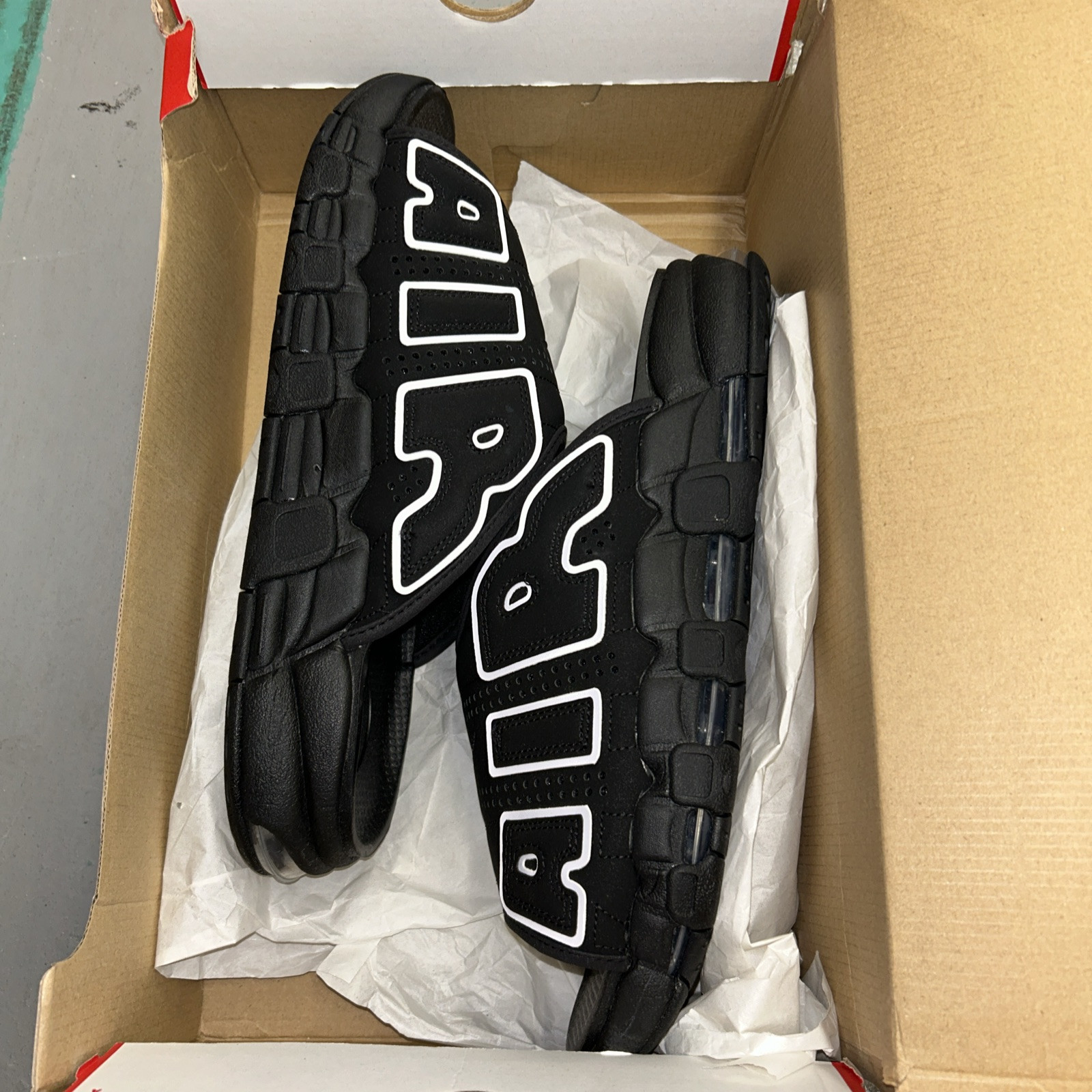 Elevate your style and performance with the Nike Air More Uptempo Black Slides, a perfect blend of comfort and classic design. Crafted with a sleek nubuck upper and a durable rubber outsole, these slides are designed to provide maximum cushioning and support for all-day wear. The adjustable straps ensure a secure fit while the breathable and moisture-wicking lining keeps your feet cool and dry. Whether you're hitting the gym or the streets, these size 15 sneakers cater to both casual and activewear occasions. The solid black color paired with the iconic Air More Uptempo design makes them a versatile addition to any outfit. Ideal for basketball, running, or simply enjoying a casual day out, these slides are a testament to Nike's commitment to quality and style.
