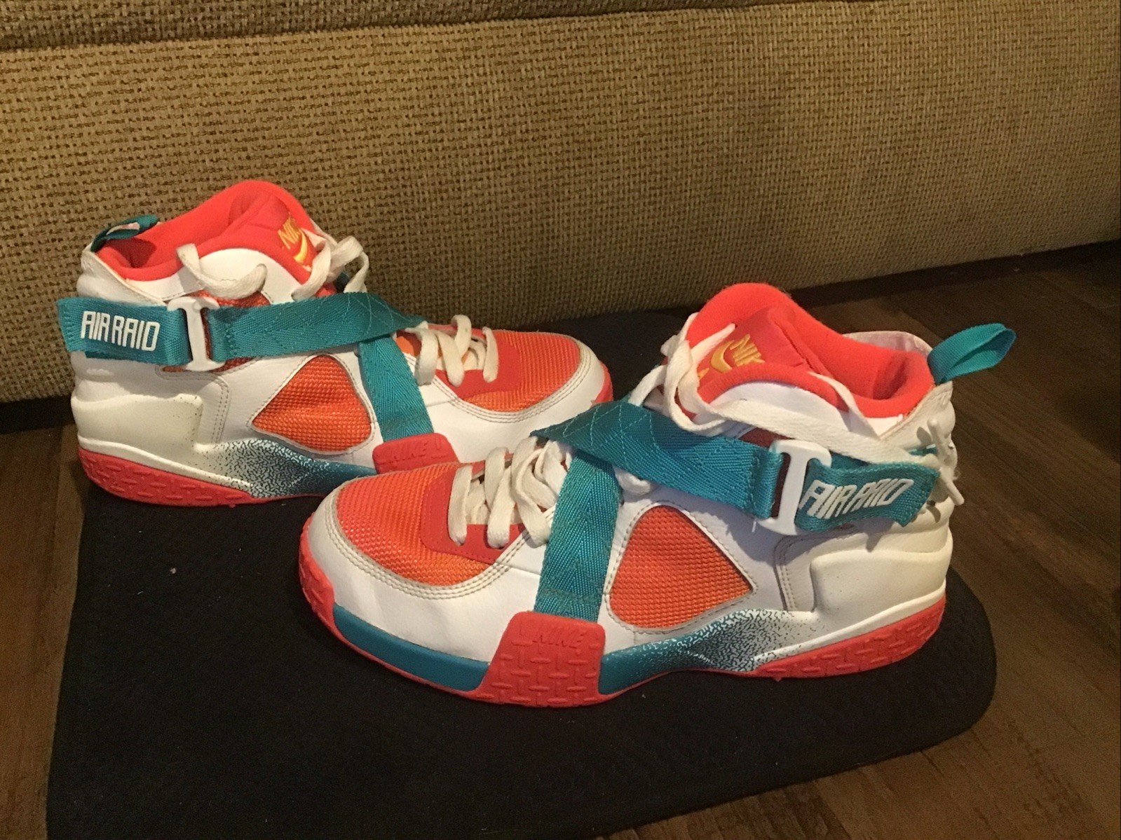 The Nike Air Raid Men's sneaker in size 8 features a stylish white color with accents of Atomic Mango, Turbo Green, and Laser Crimson. This athletic shoe from the Nike Air Raid product line combines a classic silhouette with modern technology, offering both fashion and function for the active man. With its iconic Nike branding and unique color scheme, this sneaker is sure to make a statement both on and off the court.