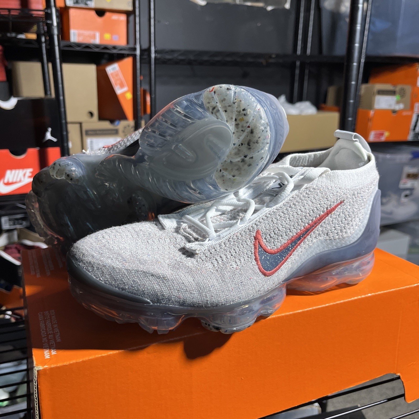 The Nike Air VaporMax 2021 Flyknit Women's Shoes in pink and grey are a stylish and comfortable option for active women. Featuring a lace-up closure, cushioned insole, and rubber outsole, these sneakers are designed for all-day wear and various activities such as gym training, walking, and jogging. The Flyknit fabric upper provides breathability and flexibility, making them suitable for all seasons. With the iconic Nike Air VaporMax technology and signature accents like lace, embroidered logos, and a solid pattern, these sneakers are a fashionable and functional choice for women on the go. Missing lid