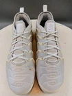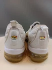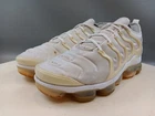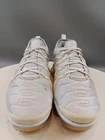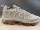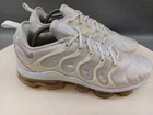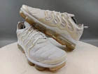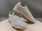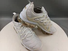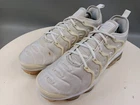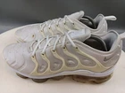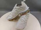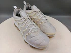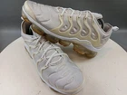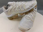 There is a small hole on the toe box of the right shoe. See photos for more details. Elevate your activewear and casual outfits with these Nike Air Vapormax Plus shoes. Designed with a sleek low top shoe shaft style, these sneakers come in a classic white color with accents of pure platinum. The shoes feature a lace-up closure for a secure fit and a rubber outsole for slip-resistant traction. With arch support, cushioning, and padded insoles, these shoes provide comfort and performance for various activities such as gym and training, track and field, tennis, walking, school, cross training, dance, CrossFit, basketball, and running. The Nike VaporMax product line boasts limited edition designs, making these shoes a retro-inspired addition to your collection.