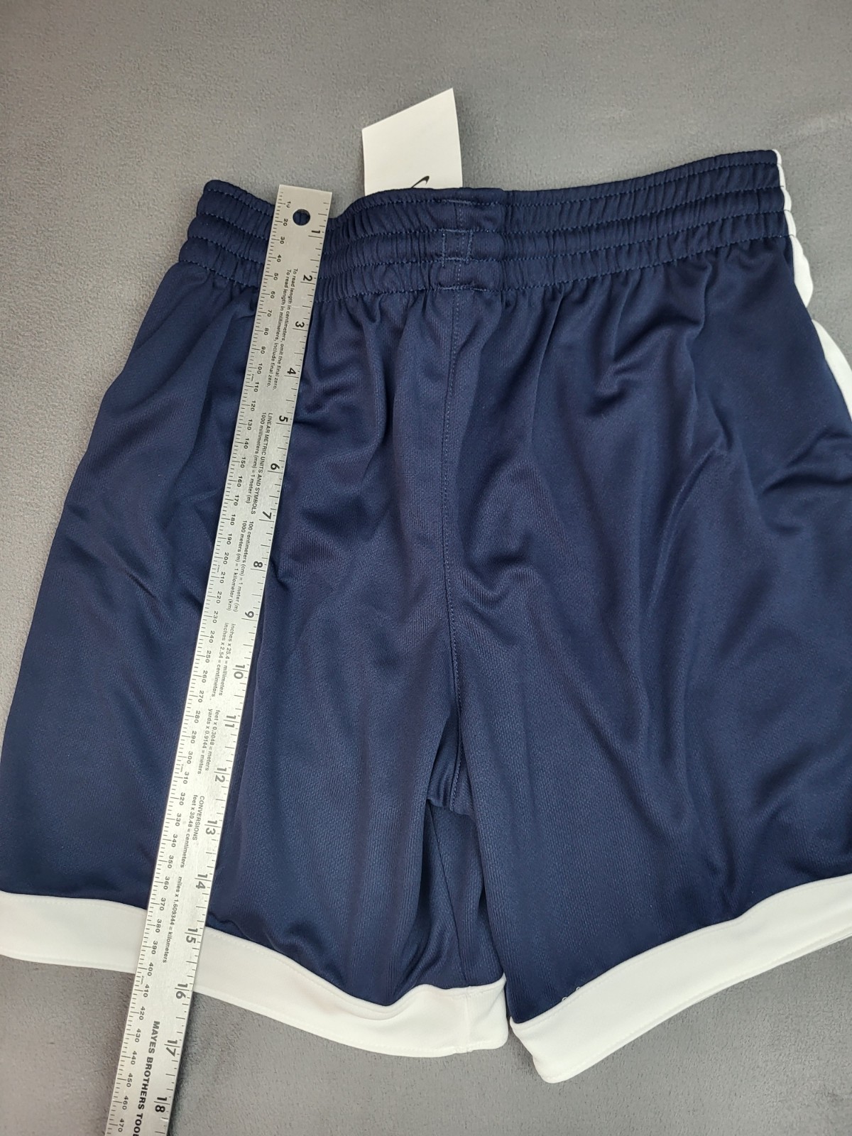 These Nike athletic shorts offer a classic look with performance features. The navy blue fabric is accented with a clean white trim and an embroidered swoosh. Built with Dri-FIT moisture-wicking technology , they are designed to keep you dry during basketball, running, or gym workouts. They feature a longer 9-inch inseam for added coverage, an elastic waistband with an internal drawstring, and convenient side pockets