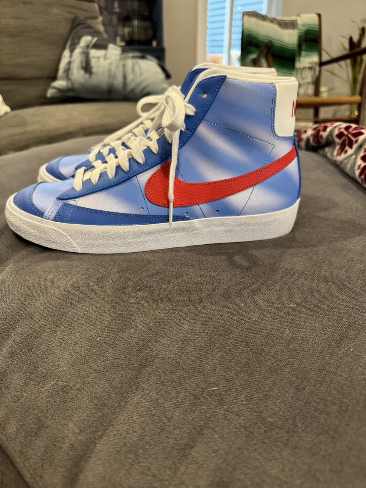 The Nike Blazer Mid '77 Vintage Blue/White Sneakers are a stylish and classic sneaker design that combines both retro charm and modern comfort. Featuring a timeless blue and white color scheme, these sneakers are perfect for adding a touch of nostalgia to any outfit. With a comfortable mid-top silhouette and durable construction, these Nike Blazers are a versatile option for everyday wear or casual occasions.