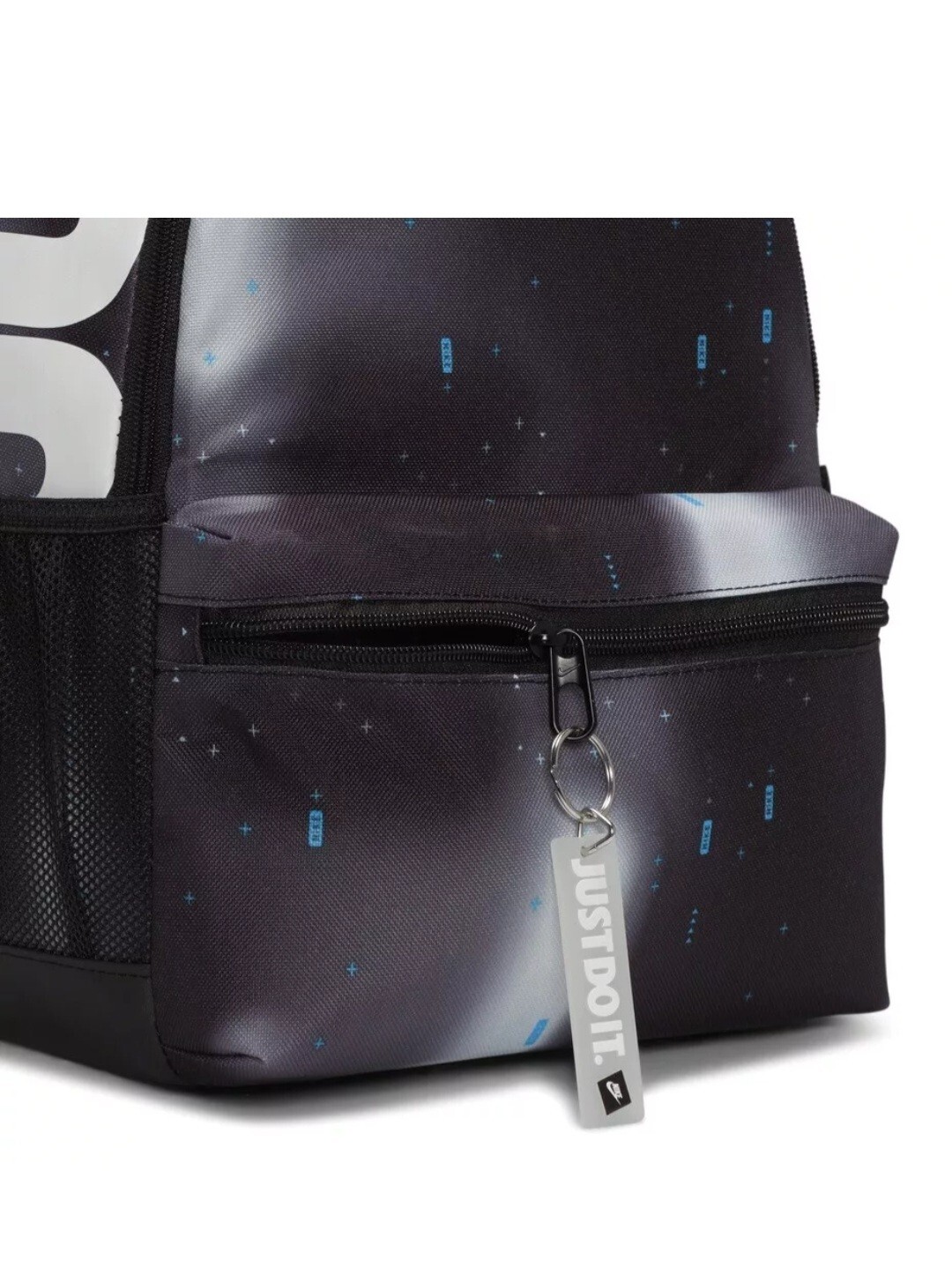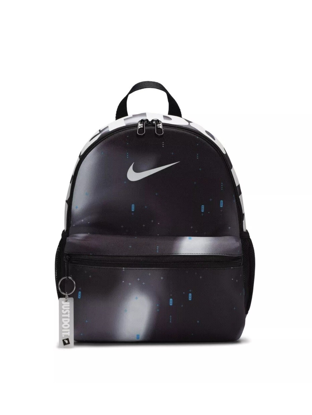 Nike Brasilia Just Do It JDI Mini Backpack Bag - 2 mesh side pockets provide space for water bottles and small goods - Padded shoulder straps are adjustable for a comfortable fit - Haul loop provides an alternate carrying option Sku: DR6095 Size: Small 13" H x 10" W x 5" D Color: Black - Glow in the dark “Nike” Fabric : 100% polyester Condition: NEW with tags