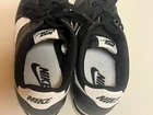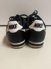 The Nike Cortez Black White sneakers in size 6.5Y or 8 Women's are a retro style shoe with a solid black color and white accents. This low-top shoe features a lace-up closure, leather upper material, rubber outsole, and a foam insole for comfort and performance. Perfect for activewear, casual, or workwear occasions, these sneakers are designed for walking, cross training, or running and jogging activities. The Nike Cortez model is known for its colorful, classic, and sporty theme, making it a stylish and practical choice for any season.