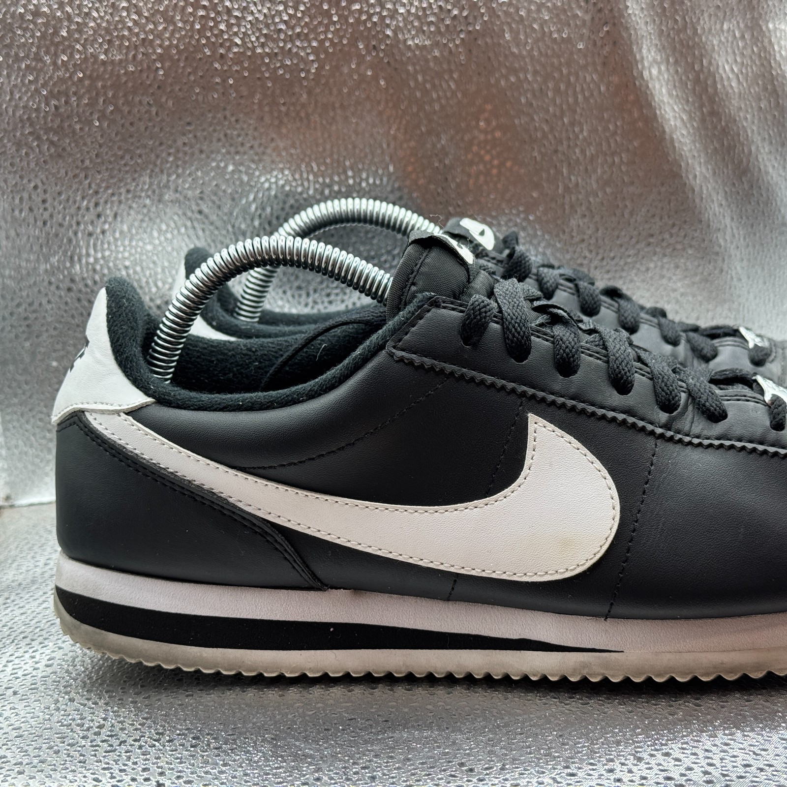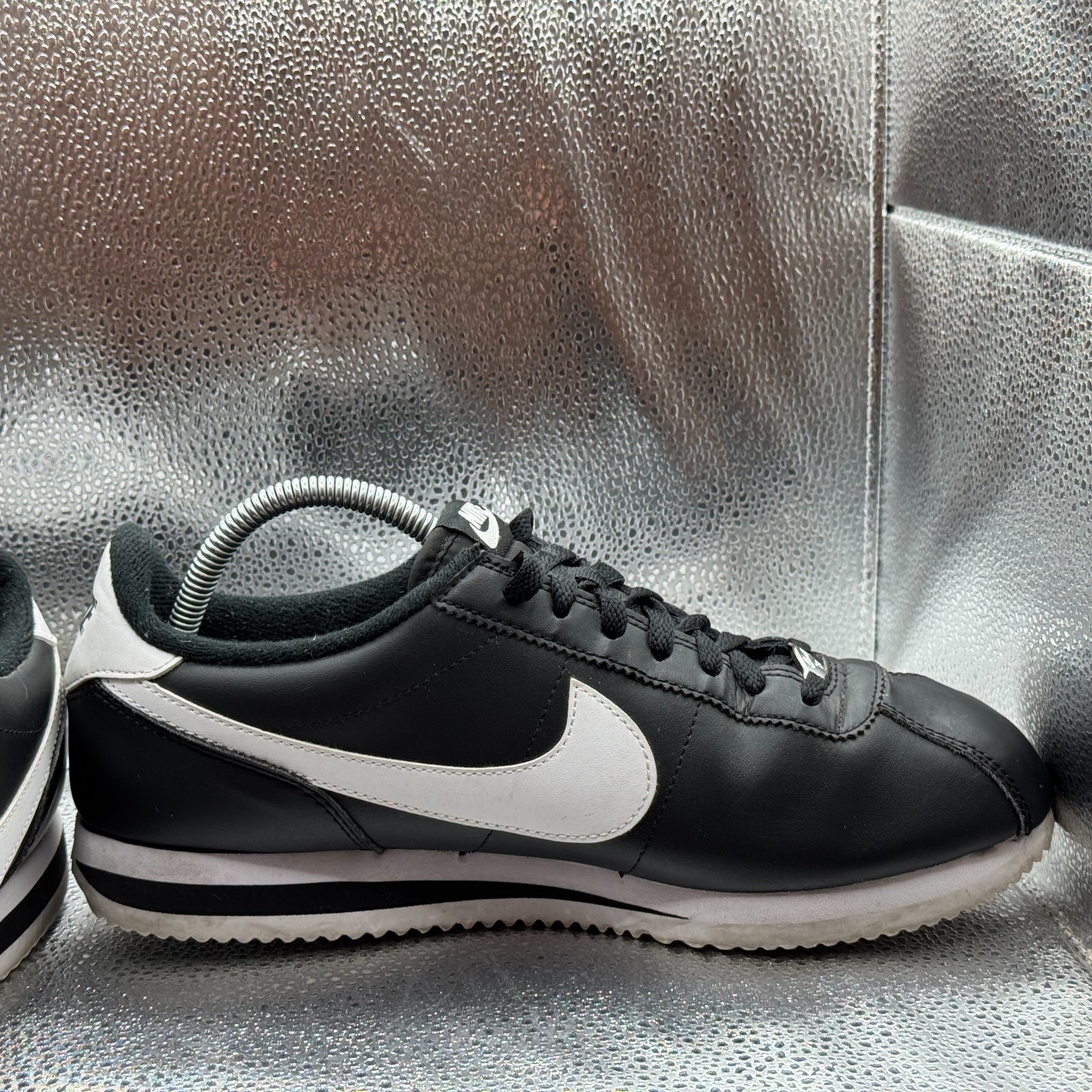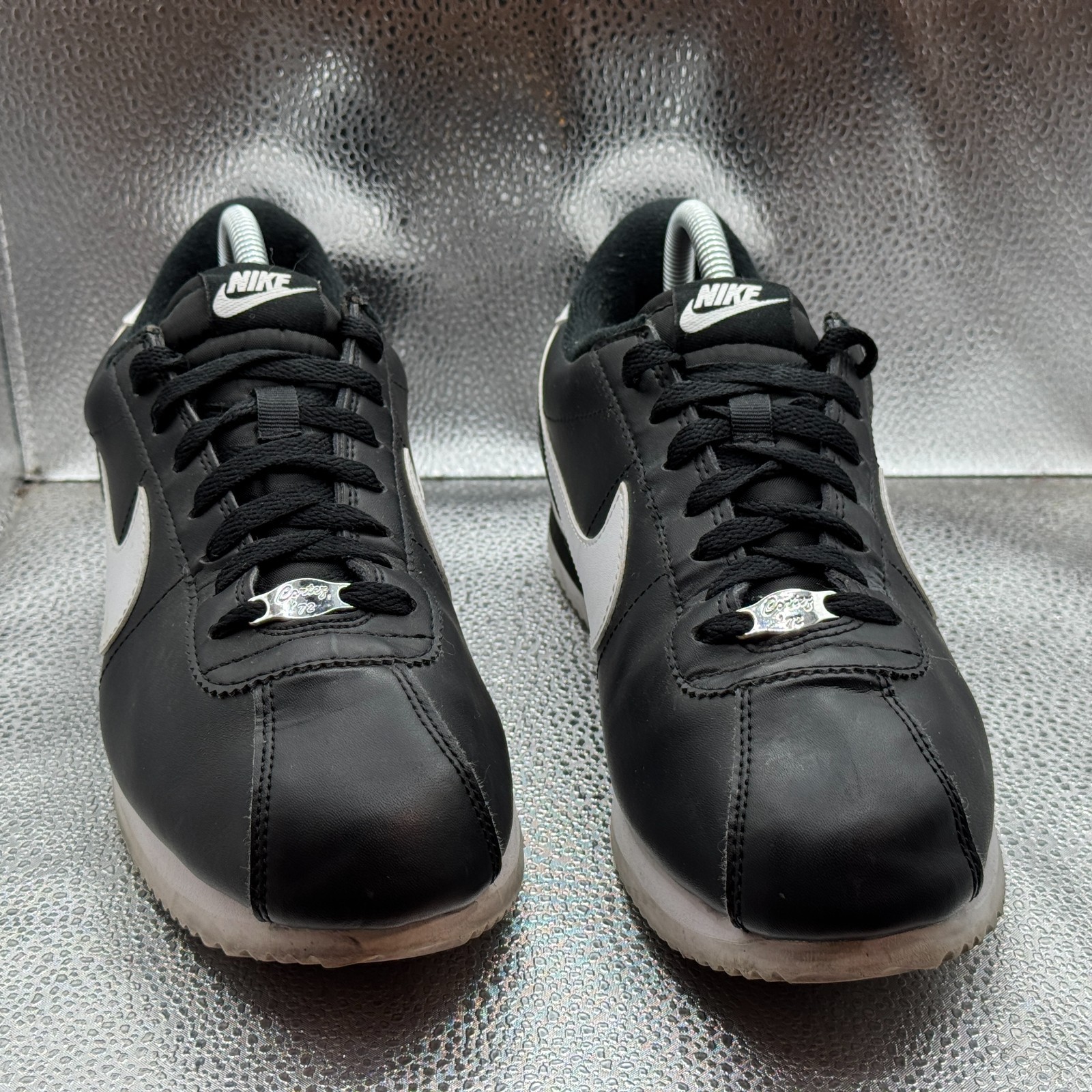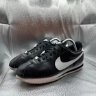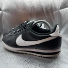 The product is a pair of Size 9.5 Nike Cortez Men's Black White Leather Comfort Shoes Sneakers 819719-012. These sneakers feature a lace-up closure, rubber outsole, and leather upper material for a durable and comfortable fit. With a style code of 819719-012 and a model of Nike Cortez, these athletic shoes offer arch support and cushioning for various activities like walking. The black color with white accents make them versatile for casual or activewear occasions in any season. Made in Indonesia, these sneakers are a stylish and practical choice for men looking for a quality footwear option.