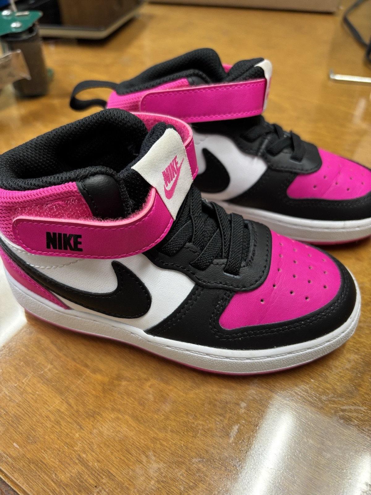 The Nike Court Borough Mid TD Kids Size 9C Black Pink White Hook and Loop Sneakers are a stylish and comfortable option for active girls. With a low heel height and hook & loop closure, these sneakers are perfect for casual or activewear occasions. The black color with pink accents and Nike logo add a fun pop of color to the classic sneaker design. Made with synthetic upper and lining materials and a fabric insole, these athletic shoes are suitable for various activities like gym training, skateboarding, and basketball, making them a versatile choice for everyday wear.