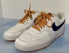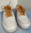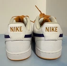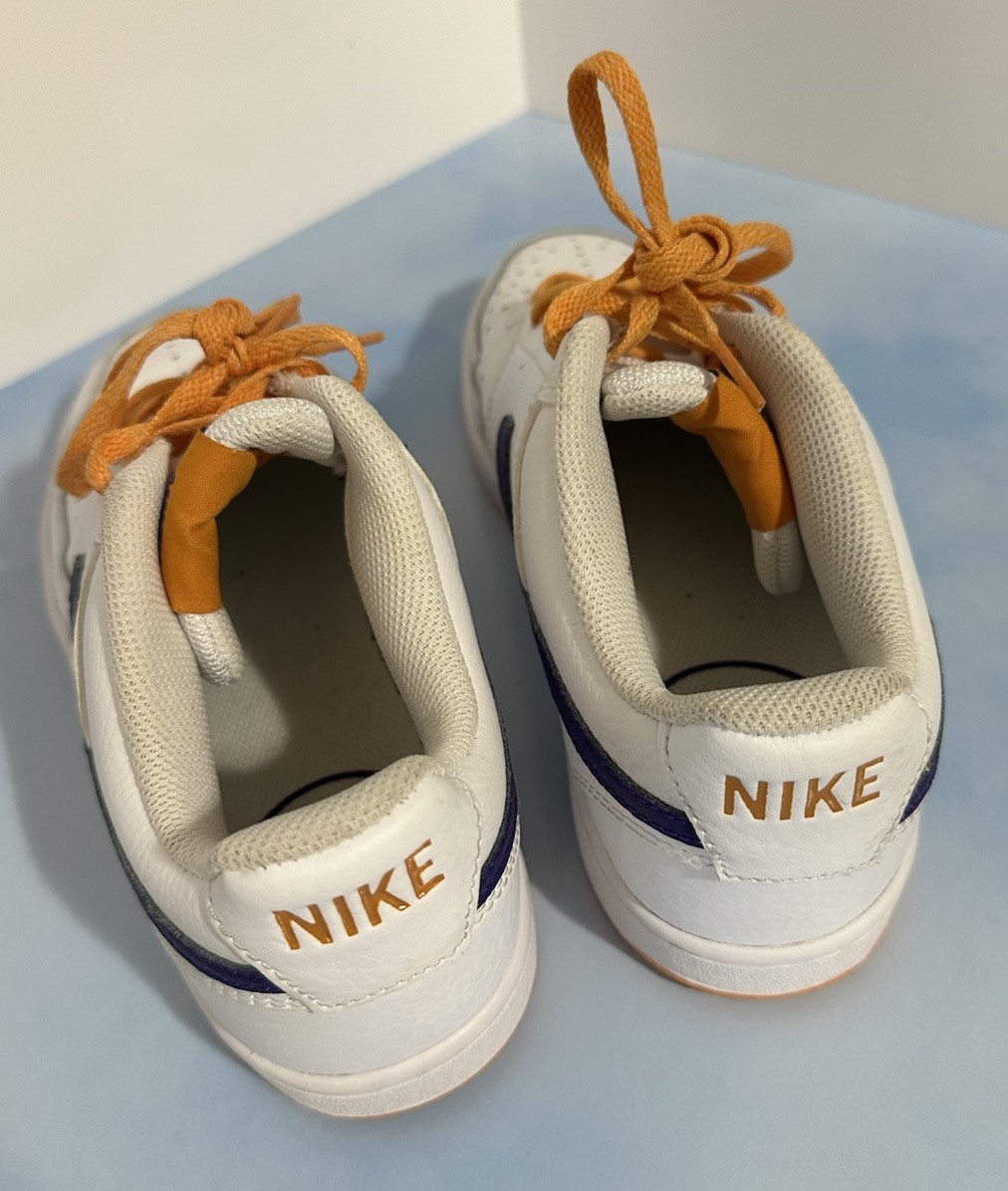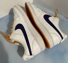 Nike Court Vision Low Electro Purple White Gold 2020 Shoes Men’s size 7.5 (7 1/2) are a stylish athletic sneaker designed for men. With a low top shaft style and sleek white color with purple and gold accents, these shoes combine both fashion and functionality, remind you of Los Angeles Lakers colors. Released in 2020 as part of the Nike Court product line, these shoes are inspired by the legendary Lakers player Kobe Bryant, making them a must-have for sneaker enthusiasts and fans of the team. These are in excellent pre-owned condition, size tags were cut out of the shoes, please view photos, my teenage son wore them to school a few times and they have been stored away in his closet. He has a lot of shoes that he has outgrown quickly, please view other listings.