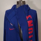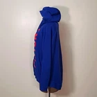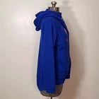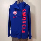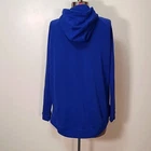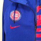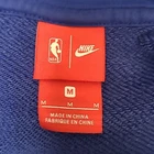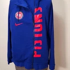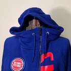 very cool women's Detroit Pistons zip up hoodie by Nike, size medium. this hoodie is made of French Terry in Pistons royal blue. the zipper is set to the side and has an inside placket that can keep your front covered, even if the hoodie is unzipped. Longer in the back than front. it has a high neck, side pockets and inside pocket, rubber Pistons logo, metallic red Nike swoosh, reflective Pistons logo tag at hem, and bottom 3/4 of the word "Pistons" running almost the entire length of the zipper. awesome piece for any fan! there may be very slight fade, otherwise it's in excellent pre-owned condition Approximate flat lay measurements chest, armpit to armpit 22.5" length, shoulder to hem (front) 23" sleeve 23"
