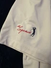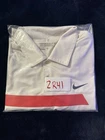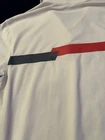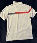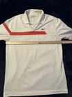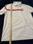 The Nike Dri-Fit Tour Performance Golf Polo Shirt is a classic and stylish option for men who enjoy playing golf. This white polo shirt features a grey and red striped pattern, short sleeves, a collared neckline with a button-down style, and a chest size of 41 inches. Made with Nike's Dri-FIT technology, this shirt is designed to keep you comfortable and dry during your golf game, making it a practical and fashionable choice for any golfer. Might be a tiny bit dingy or is simply an off white color. No yellowing or staining.