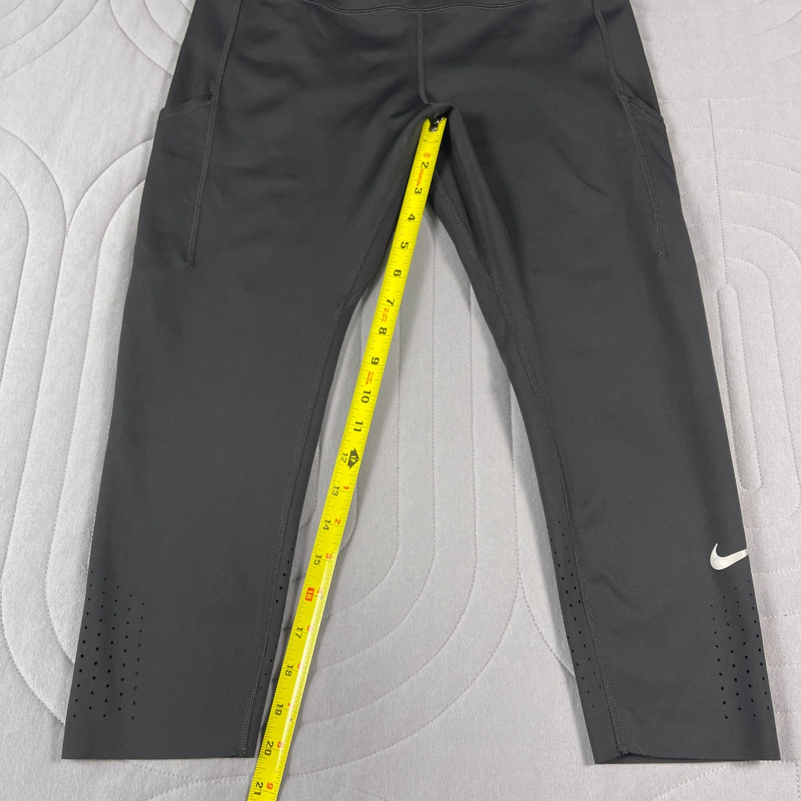 The Nike Dri-FIT Women's Black Running Leggings are designed for athletic performance and comfort during workouts. Made of spandex and polyamide fiber, these leggings feature a drawstring closure, tapered leg style, and solid black color. The mesh fabric type and compression area in the legs provide breathability and support for activities like gym training, walking, yoga, hiking, and running. With quick-drying and lightweight features, these leggings are suitable for all seasons and are machine washable for easy care. Perfect for active women looking for high-quality athletic pants.