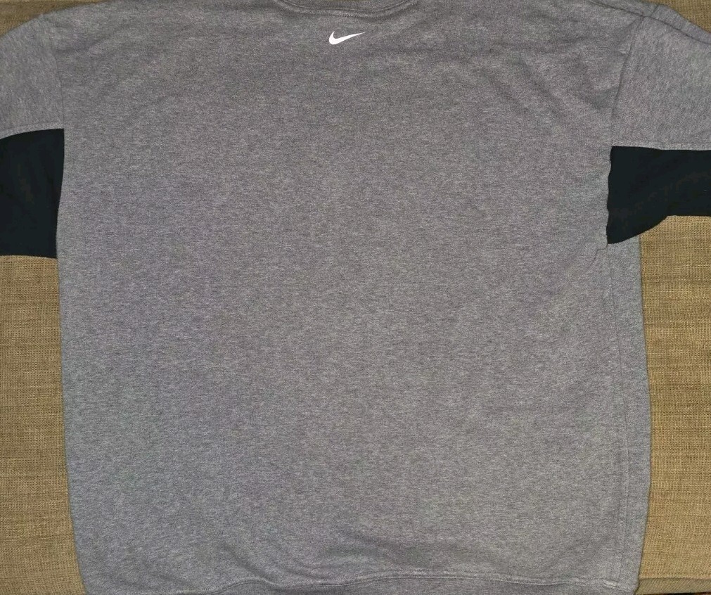 This Nike sweatshirt features a solid pattern with a crew neckline and long sleeves, making it perfect for any sports activity. It has a pullover closure and is made of a comfortable polyester and cotton blend fleece fabric that is machine washable. The gray and black color combination gives it a sleek and modern look, while the Nike logo accents add a touch of style. This sweatshirt is designed for regular fit and is suitable for both men and women, making it a versatile addition to any sportswear collection.