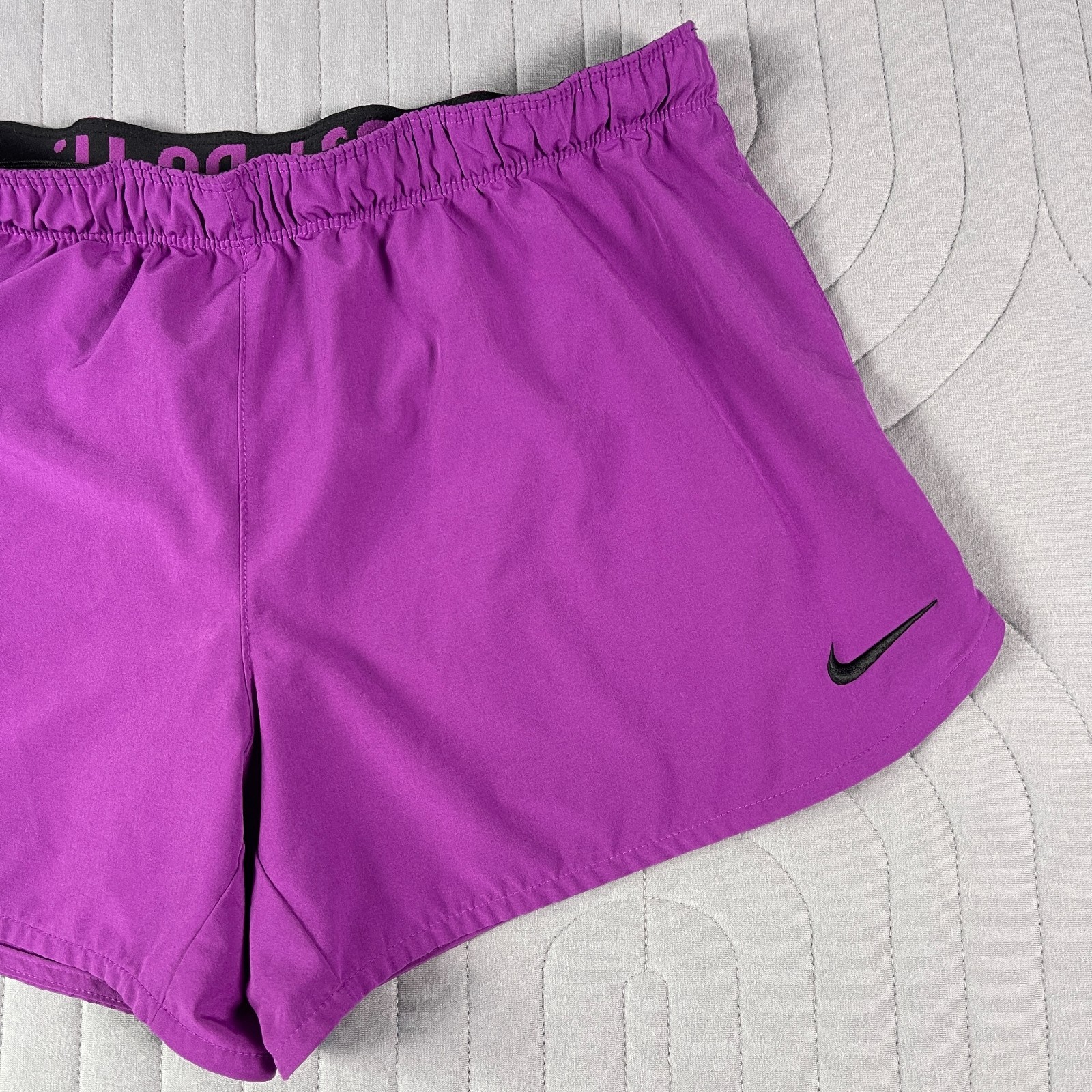 The Nike Dri-Fit Purple Running Shorts for women in size Large are designed for athletic activities, specifically running and jogging. Made of polyester with a solid purple color, these shorts feature a drawstring closure, lined interior, and stretch material for comfort and flexibility. The 3.5-inch inseam and athletic fit make them suitable for active women looking for supportive and stylish activewear for the summer, fall, and spring seasons. Machine washable for easy care, these Nike shorts are a great addition to any active wardrobe.