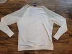 This Nike Dri-Fit sweatshirt top is perfect for active women who want to stay comfortable while working out. The top features a scoop neck and long sleeves with a solid pattern and ivory color. It is made of a nylon blend mesh fabric that allows for ventilation and breathability during intense workouts. The sweatshirt also has the Nike logo on it, making it a stylish choice for athletic women. The women's sweatshirt is a size XL and has a regular fit, making it a great choice for women who want a comfortable and relaxed fit. It is designed for athletic activities and can be worn for a variety of workouts. This Nike Dri-Fit sweatshirt is a must-have for women who want to stay comfortable and stylish while working out. K