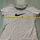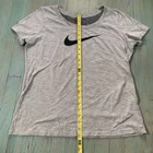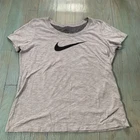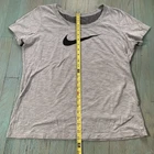 This Nike Dri-Fit Women Gray Crop Athletic Tee in size L features a Crew Neck neckline and Short Sleeve design, making it ideal for activewear. Made of lightweight and breathable cotton material, it offers easy care and can be worn in all seasons. The solid color adds a touch of style to the cropped tee, which showcases the Nike logo and "Just Do It" theme. Perfect for gym workouts, running, or everyday leisure activities, this top is a comfortable and functional addition to any athletic wardrobe. Measurements in photos