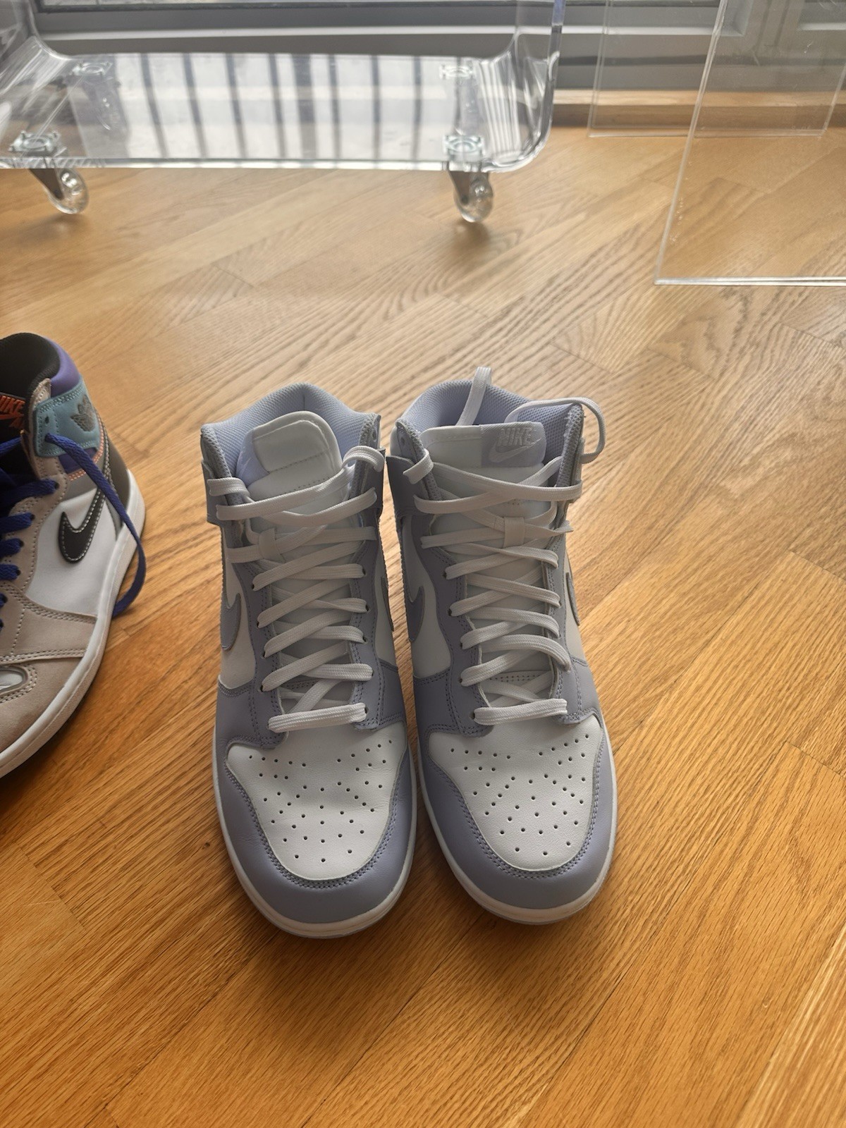 For sale is a pair of Nike Dunk High “Aluminum” sneakers in a women’s size 9.5 (Style Code: DD1869-107). This clean and timeless colorway features smooth white leather underlays paired with pastel aluminum blue overlays and accents. A versatile and stylish pair that goes with nearly everything. • Model: Nike Dunk High • Style Code: DD1869-107 • Size: Women’s 9.5 (UK 7 / EUR 41 / 26.5 cm) • Colorway: White / Aluminum (Light Blue) • Condition: Gently worn. Light creasing and minimal signs of use (please review photos). Still in excellent condition with lots of life left. • Release Year: 2021 These are a must-have for Dunk fans and sneaker lovers who want a classic pair with a clean, icy look. Shipping: • Ships within 2 business days. • Carefully packaged for protection during delivery.