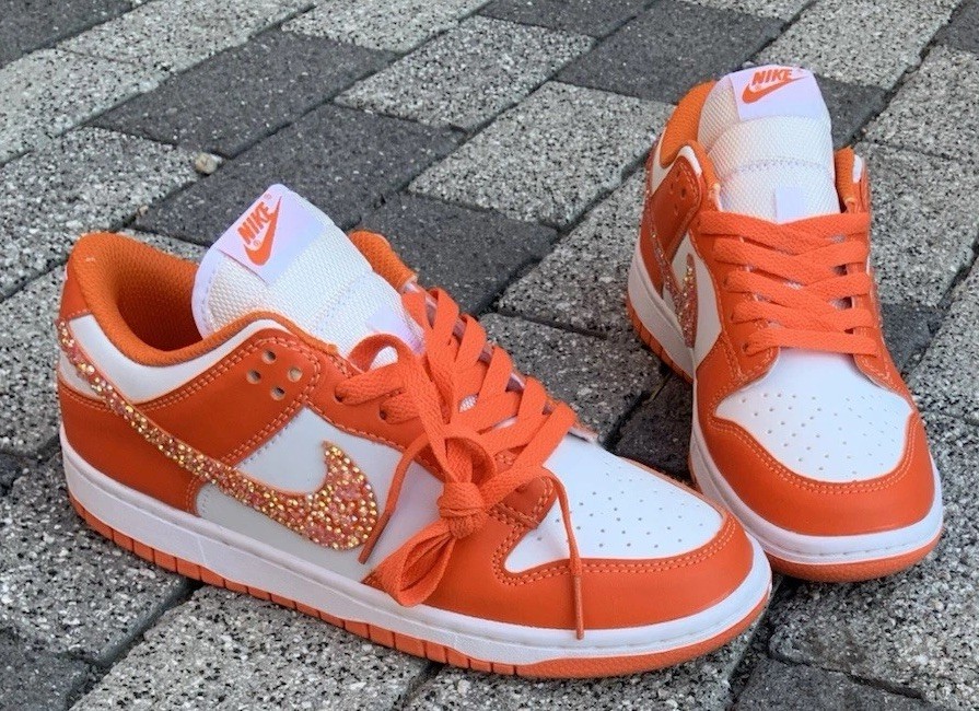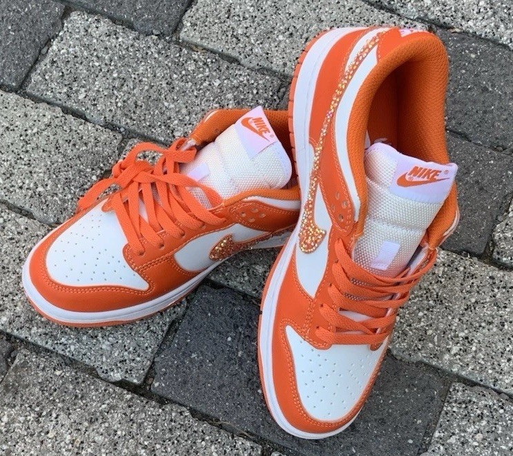 Nike dunk women’s orange and white customized blinged out kicks size 8 Eur 39 volt kept comes with pvc volt box brand new CUSTOMIZED NO RETURNS