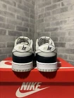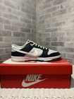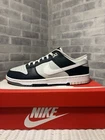 Nike Dunk Low Retro Split Deep Jungle is a men's athletic sneaker in blue with a low-top leather shoe shaft. It features a unique split colorway of Deep Jungle, White, and Light Silver. Never worn.
