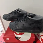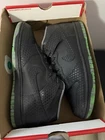 This Nike Dunk Mid is a men's athletic sneaker in a black colorway featuring a Halloween-themed design inspired by the Headless Horseman. The shoe has a mid-top shaft style with a leather upper and a color combination of black, smoke grey, and campfire orange. It comes in a US size 10.5 and belongs to the Nike Dunk product line, with a style code of FQ8749-010. This limited edition release is set for 2023 with a release date of October 27th.