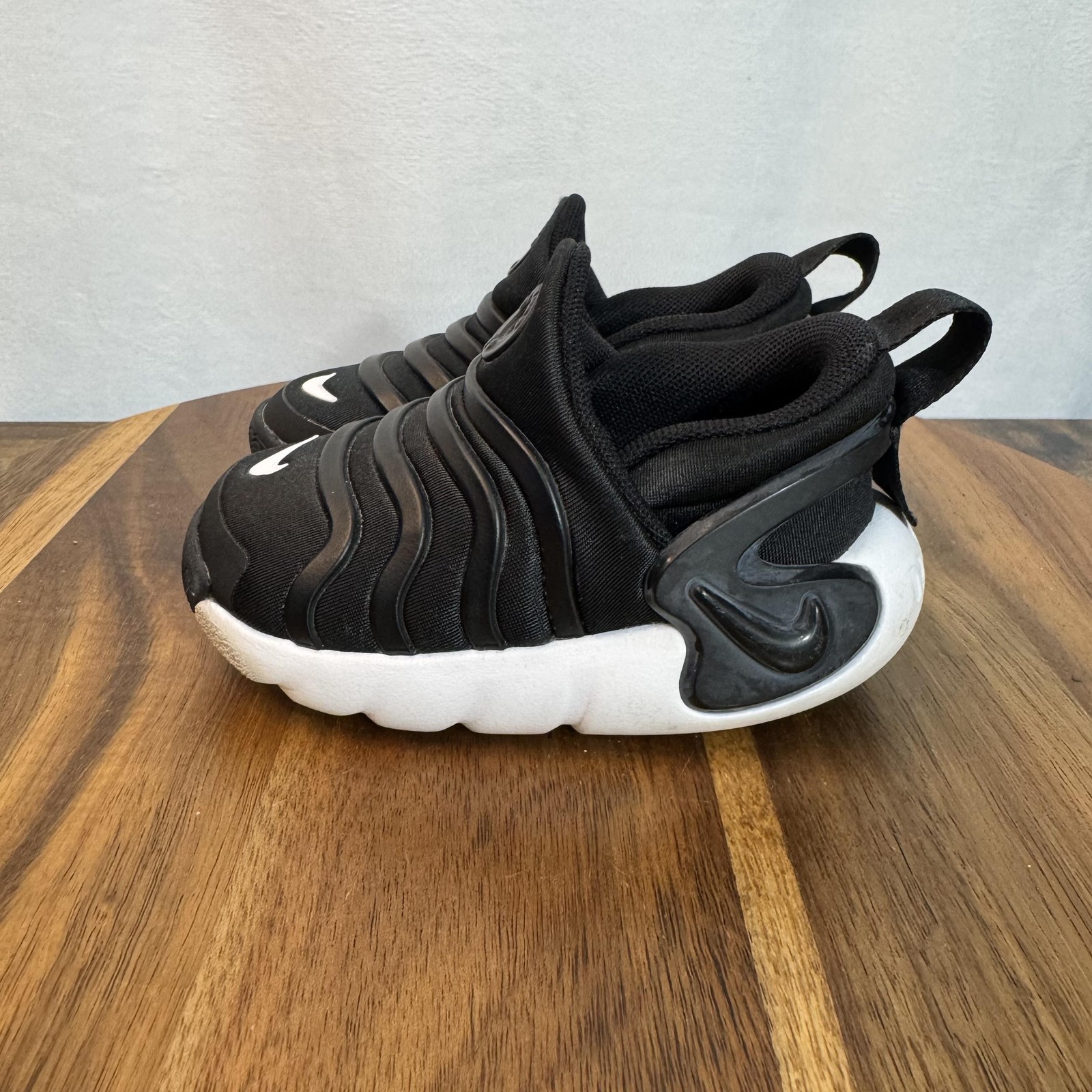 Brand: Nike Style: Dynamo Go slip-on toddler shoes with sculpted foam sole and wave-like rubber overlays. Color: Black upper with white midsole and outsole, black and white Nike Swoosh logos. Size on tag: US 5C; UK 4.5; EUR 21; CM 11; BR 20; CN 110(2.5). Style/Model code: H3438-001 (per inner tag). Details: Easy-on collapsible heel with pull tabs, cushioned textile lining, flexible podded outsole for traction, lightweight everyday sneaker design.