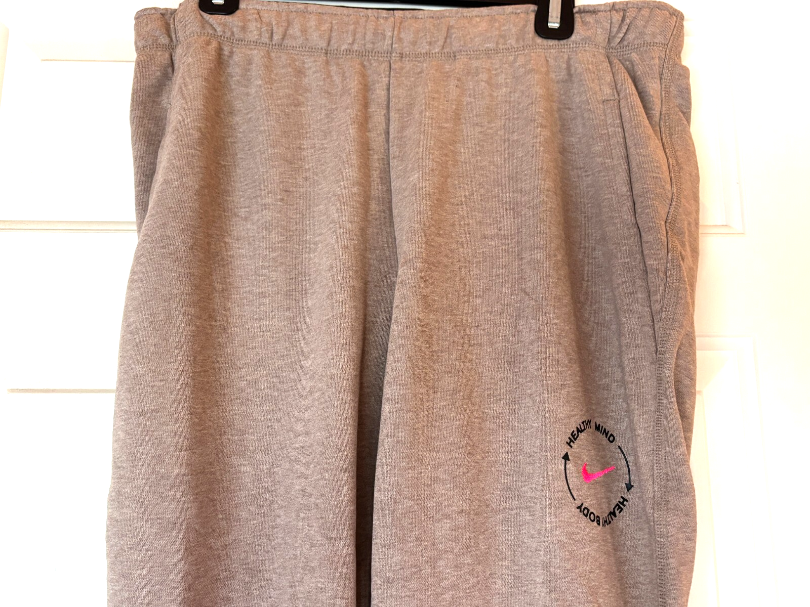 Brand: Nike Fleece sweatpants that are very soft. Elastic waist with drawstring. Front slash pockets. Says Healthy Mind Healthy Body on leg. Brand new with tags Size: L Measurements: Inseam: 30" Waist (laying flat): 16.5" GREAT DEAL!!! SEE MY OTHER AUCTIONS FOR COMBINED SHIPPING SHIPPING POLICY: Your most expensive shipping is full price. Any additional purchases - shipping is 1/2 off. Media mail purchases cannot be combined with regular shipping. Now for the shipping details: The item comes from a smoke-free home. I ship by standard shipping. I ship very quickly upon receiving payment (usually the same day). However, shipping times do vary (sometimes up to 10 days to CA & NY). If you need your item in a hurry, please e-mail to priority shipping. My shipping costs include tracking on the package. I am not responsible (and will not refund money) for items lost in the mail.678 INTERNATIONAL SHIPPING: I ship worldwide. Please e-mail for international rates. Thanks for looking! Good luck!