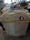 This Nike just do it T-shirt for women/girls in size L features a V-neck neckline and a bright yellow color with a Florida State Seminoles theme. The shirt is made of a cotton blend fabric with a lightweight and breathable feel, suitable for various occasions such as travel, activewear, parties, or casual wear. It has a "Just Do It" slogan and the FSU and Swoosh logos, making it a stylish and comfortable choice for fans of college sports or Florida State University.