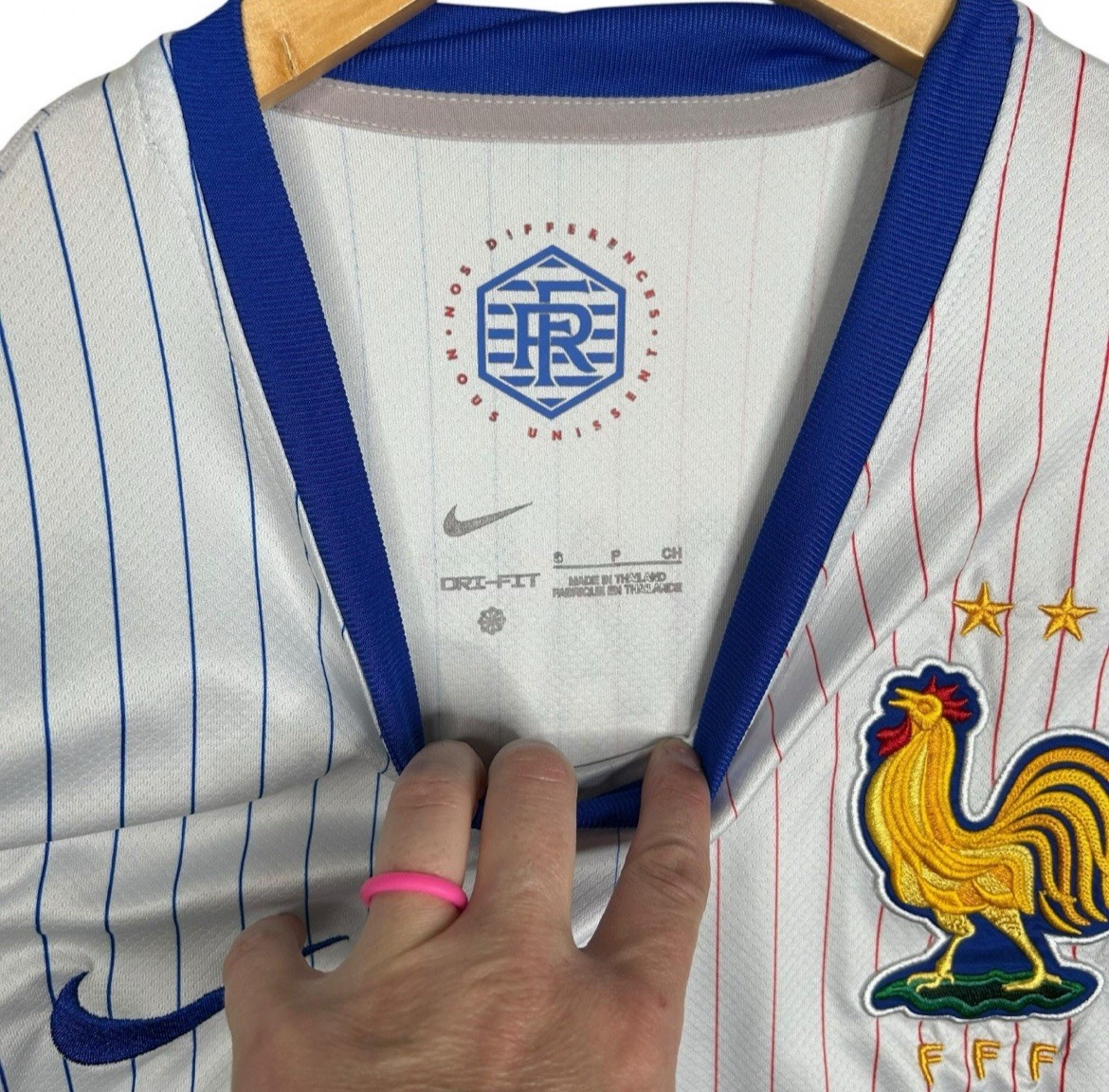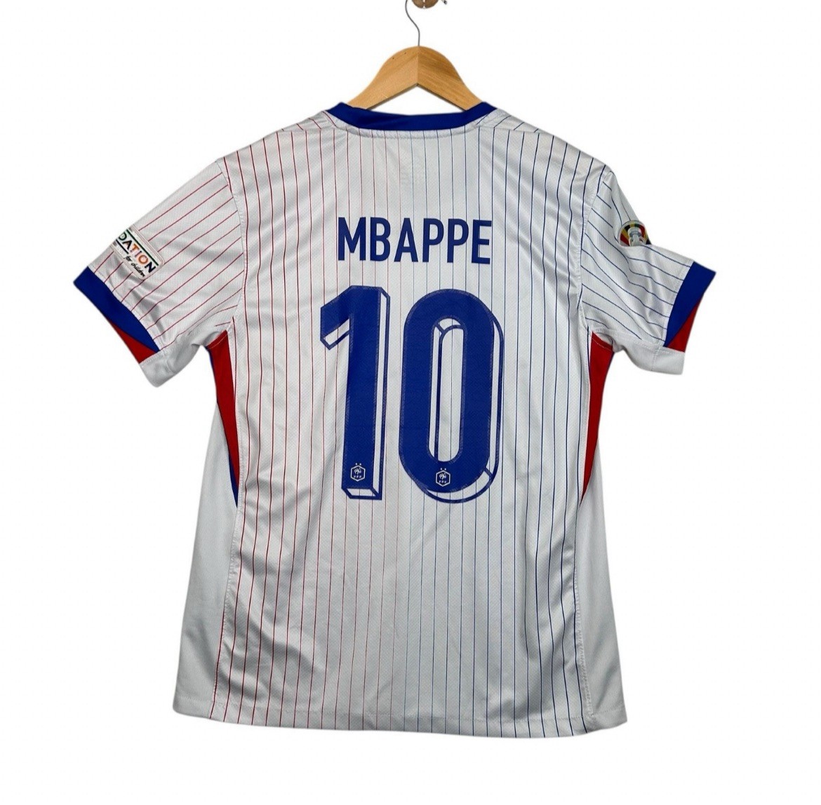 Brand: Nike Dri-FIT performance soccer jersey Team: France National Team (FFF) with two-star rooster crest Player/Number: MBAPPE 10 on back; 10 on front Design: White base with blue and red pinstripes, blue collar and sleeve cuffs, red side insets Logos/Markings: Nike Swoosh at chest; FFF crest; "ENGINEERED" Nike authenticity jock tag at hem Patches: UEFA Euro multicolor trophy patch on one sleeve; UEFA FOUNDATION for children patch on the other sleeve Material: 100% polyester Technology: Dri-FIT fabric for breathable, moisture-wicking comfort Country of origin: Made in Thailand Inner tag notes: SU21 code visible on inner label Notes: please review all photos for details and compare to a similar jersey for best fit.