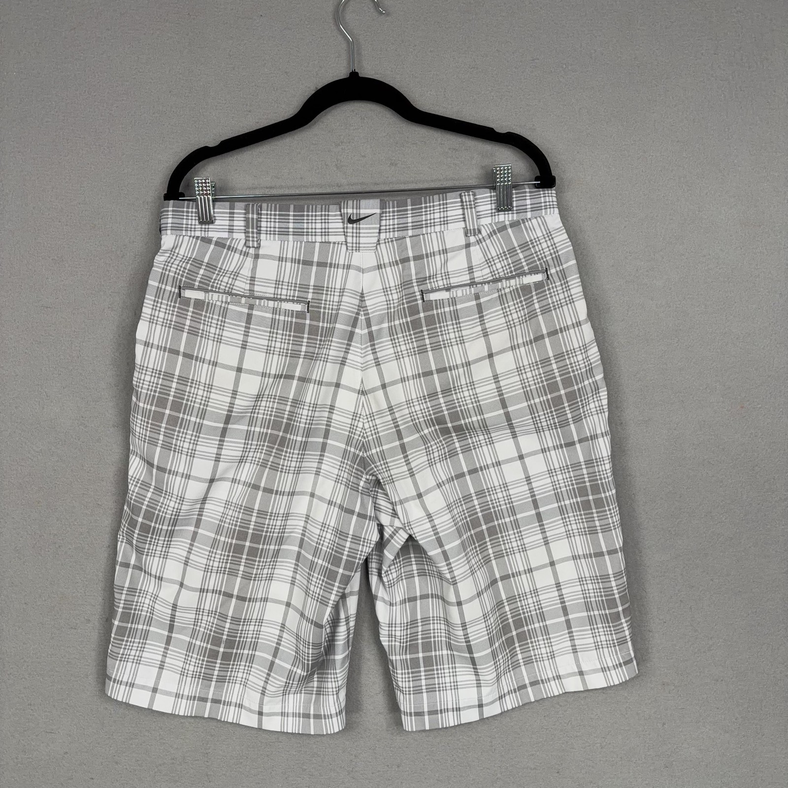 Nike Golf Shorts Mens 32 Gray Plaid Dri-FIT Performance Golf Stretch Chino Small spot on front. Lightly worn Nike Golf shorts with crisp plaid pattern. No holes, or snags; zipper, button, and pockets all functional. Inner care tags present; original retail tags not included. Brand: Nike Golf Style: Mens athletic golf shorts with gray and white plaid pattern and flat-front design. Color: Gray and white plaid; department: Men. Materials: 96% polyester, 4% spandex Dri-FIT moisture-wicking stretch fabric; made in China. Tag size: 32 (mens regular fit). Details: Belt loops, zip fly with button closure, front slant hand pockets, back welt pockets with trim, breathable quick-dry performance fabric suitable for golf or casual wear. Branding and codes: Nike Swoosh logo at back belt loop; inner waistband printed NIKEGOLF and DRI-FIT; inner tag codes SP14 0812HKC and 643379-100; RN 56323 | CA 05553. 24130 Measurements: Previous washings may change sizing on the tag. Refer to photos above for all measurements. Compare our measurements to one of your favorite garments. Measurements are approximate. All items are bagged and sealed after being photographed, then stored in a smoke free environment. Washed per eBay standards. I carefully package and ship daily. Contact me with any questions. Thanks