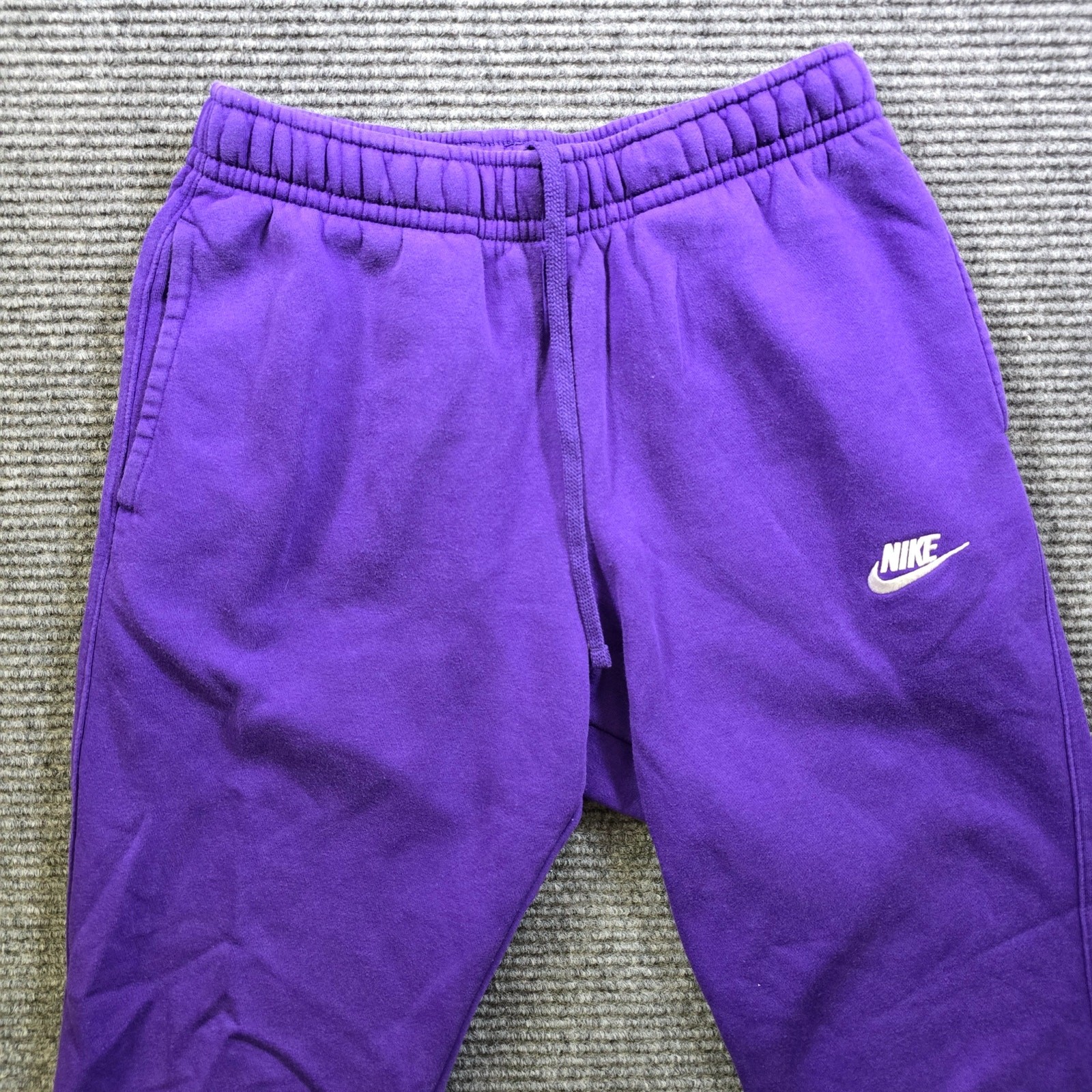 Nike women’s fleece jogger sweatpants in a bold purple colorway with classic embroidered Swoosh logo. Soft fleece interior with an elastic waistband and ribbed cuffs offers comfortable warmth for lounging, workouts, or everyday athleisure wear. Easy staple piece that pairs well with hoodies, tees, or sneakers. Color may vary slightly from photos due to lighting and monitor settings. Details Brand/Model: Nike Style: Jogger / Sweatpants Color/Wash: Purple Size: Tag size Small (Women’s) Fabric: 80% Cotton / 20% Polyester Condition: Pre-owned, good condition Key Note: Elastic waist, fleece lined, side pockets, ribbed cuffs, embroidered logo