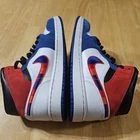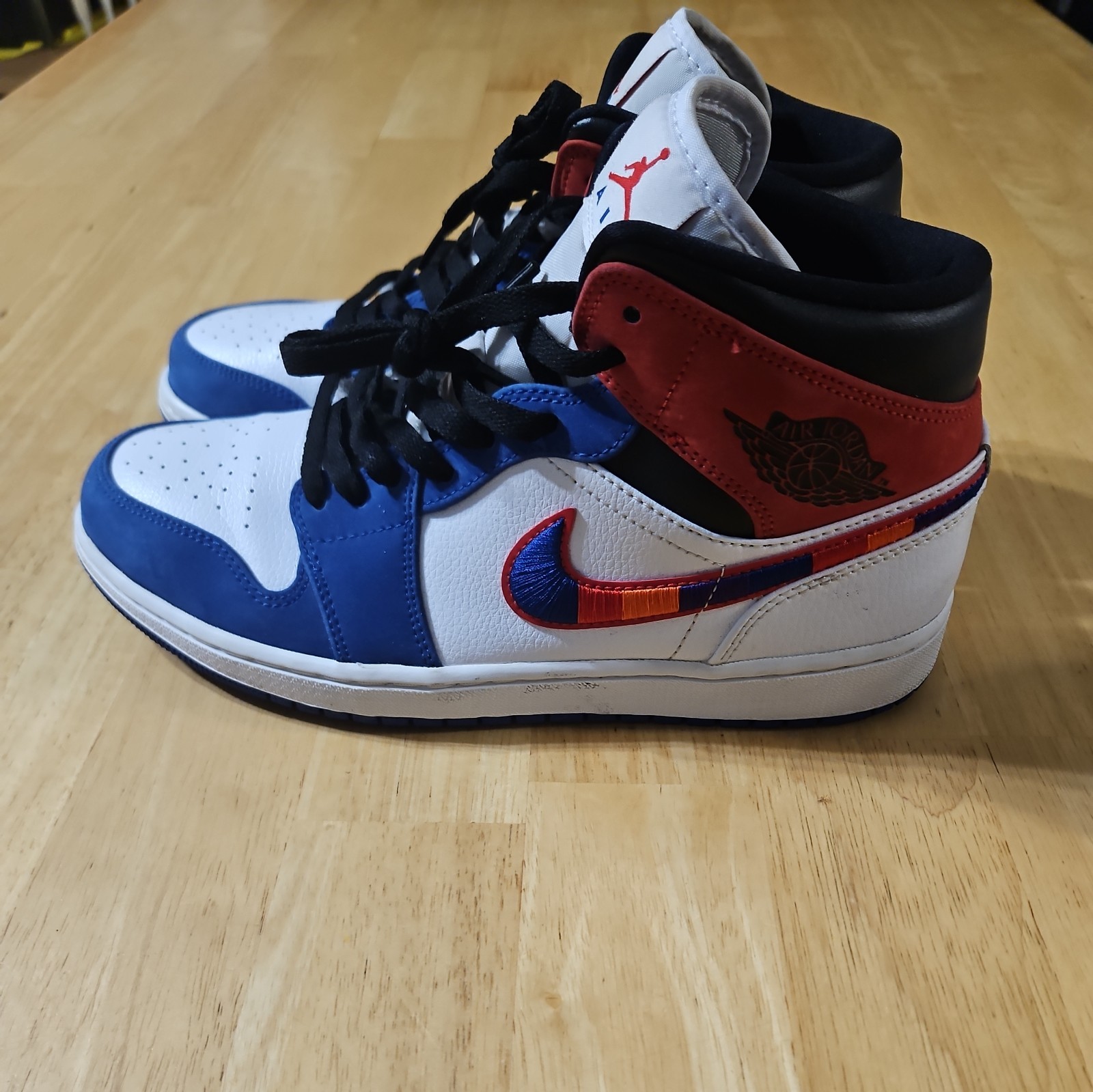 The Nike Jordan 1 Mid SE Shoes in Men's size 9 feature a classic lace-up closure, a mid-top silhouette, and a colorblock pattern in white, blue, black, and University red. These sneakers are part of the Nike Air product line and are designed for athletic activities like basketball, with features like arch support and adjustable comfort. The shoe is inspired by Michael Jordan and showcases the iconic multicolored Swoosh design, making it a stylish choice for activewear or casual occasions in summer, fall, or spring. Made with leather uppers and a rubber outsole, these Nike Jordan 1 shoes offer a blend of style and performance for the modern man.
