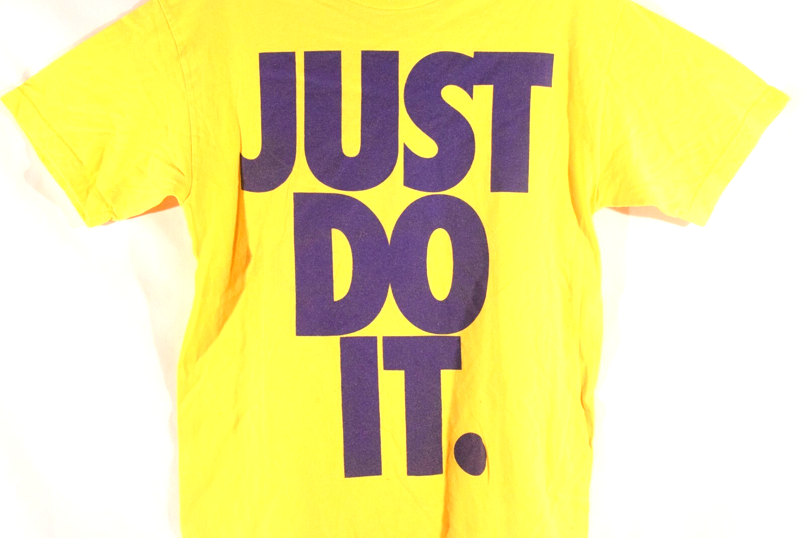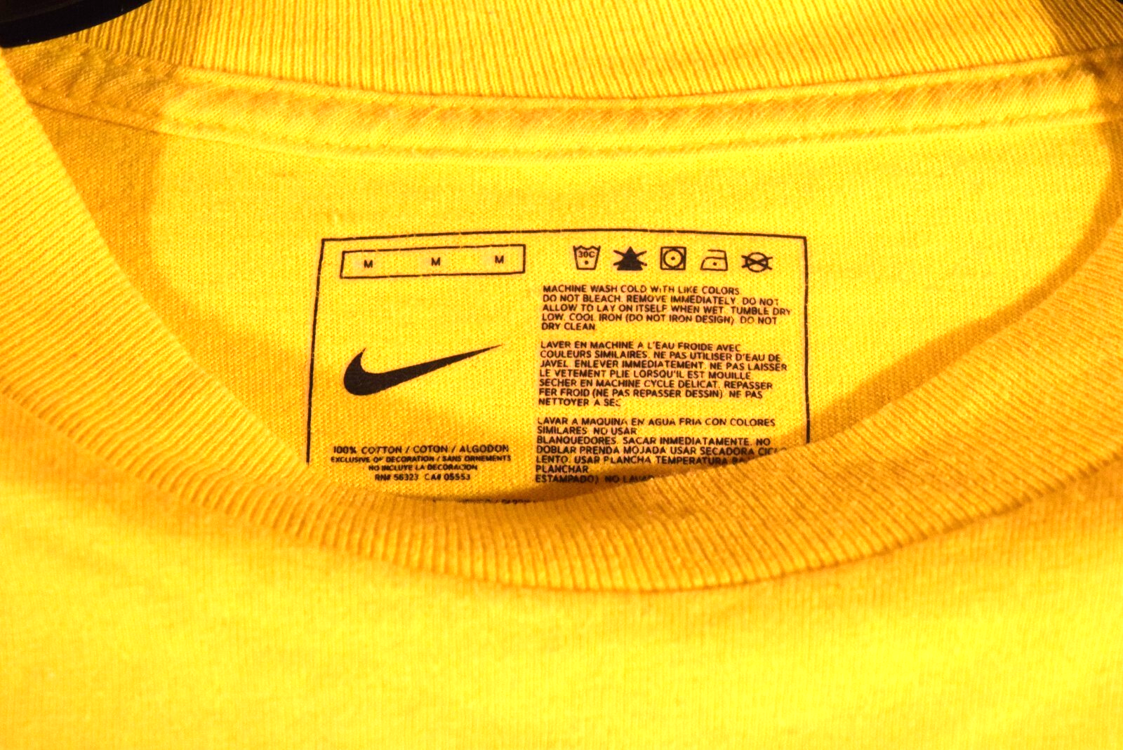 The product is a Nike Men's Cotton Crew Neck Just Do It Graphic Tee Shirt in size M. This short sleeve t-shirt features a vibrant yellow color with a classic crew neck design and the iconic Nike logo as accents. Made from comfortable cotton knit fabric, this regular fit shirt is suitable for all seasons and sports-themed occasions, making it a versatile and stylish addition to any man's wardrobe.