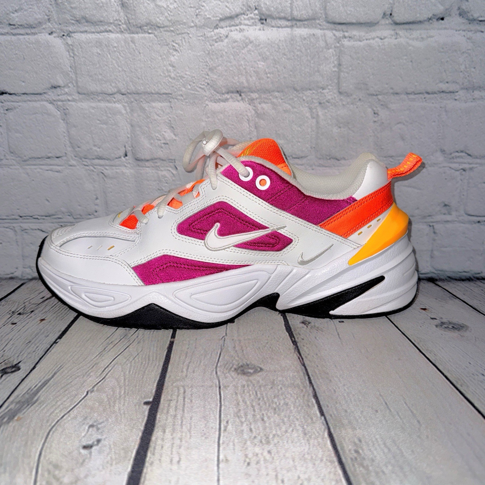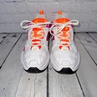 Nike size 9.5 M2K Tekno sneakers in “white/laser fuchsia”. Genuine leather upper. Fabric pink inlay, hot orange tongue & leather accents + neon orange embroidery & back rubber band. Lace closures. Padded collar & tongue. Cushioned insole. Durable black & white rubber outsole. Worn only twice briefly- EUC! Retail: $135.00