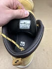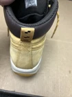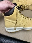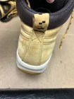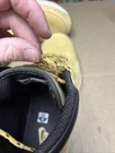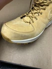 The shoes have some noticeable scuffs and marks to the front of the toes and the toe boxes. The shoes also have other signs of wear and use in various places. The right shoe is missing the right side lace end to it. See pictures to see the item.