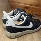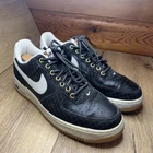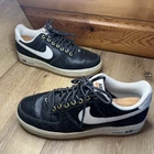 Elevate your sneaker game with these Nike Air Force 1 casual shoes. The black leather upper material provides a sleek and stylish look while the rubber outsole ensures comfort and durability. These low-top sneakers feature a lace-up closure and are perfect for all seasons. With a solid pattern and Nike's iconic branding, these athletic shoes are a must-have for any sports-themed wardrobe. The Nike Air Force product line is known for its quality and these sneakers are no exception. Don't miss out on the chance to add these iconic sneakers to your collection.