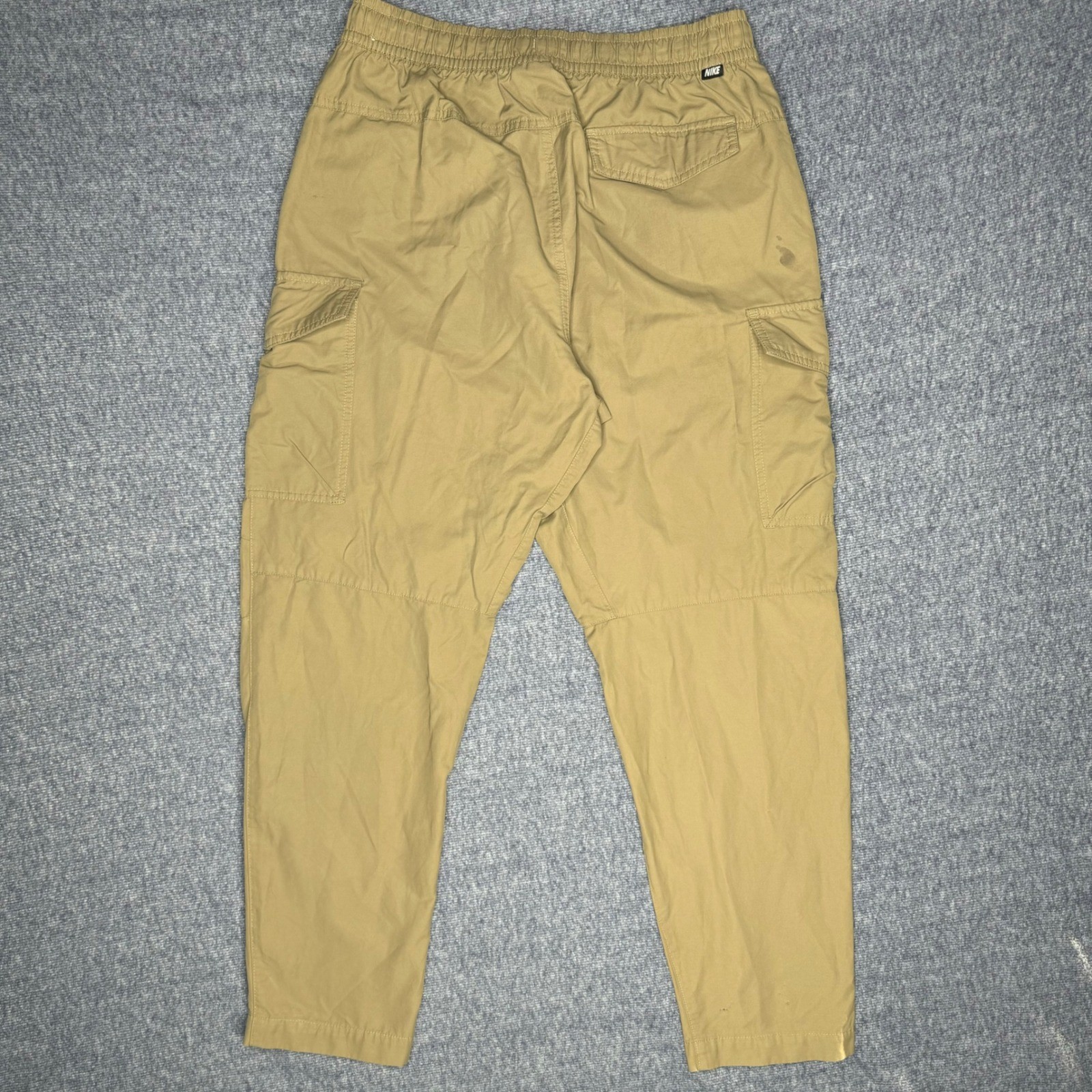 They do have a stain. See close up picture. Discover ultimate comfort and utility with these tan Nike cargo jogger pants. Designed for your active lifestyle, these pants feature a comfortable elastic waistband with an adjustable drawstring, ensuring a perfect fit every time. Multiple cargo pockets provide ample storage for your essentials, making them ideal for on-the-go needs. The relaxed fit and tapered leg offer a modern silhouette, perfect for casual outings or everyday wear. Style: Cargo Department: Men Theme: Sports, Streetwear Fit: Relaxed Material: Polyester Blend Type: Pants Features: Adjustable Waist, Elastic Waist, Pockets Front Type: Flat Front Leg Style: Tapered Accents: Logo, Zipper Occasion: Casual Closure: Drawstring, Zip Keywords: Nike pants, Men's joggers, Cargo pants, Tan pants, Size L, Drawstring pants, Elastic waist, Casual pants, Athletic pants, Comfortable pants, Streetwear, Everyday wear, Utility pants, Activewear